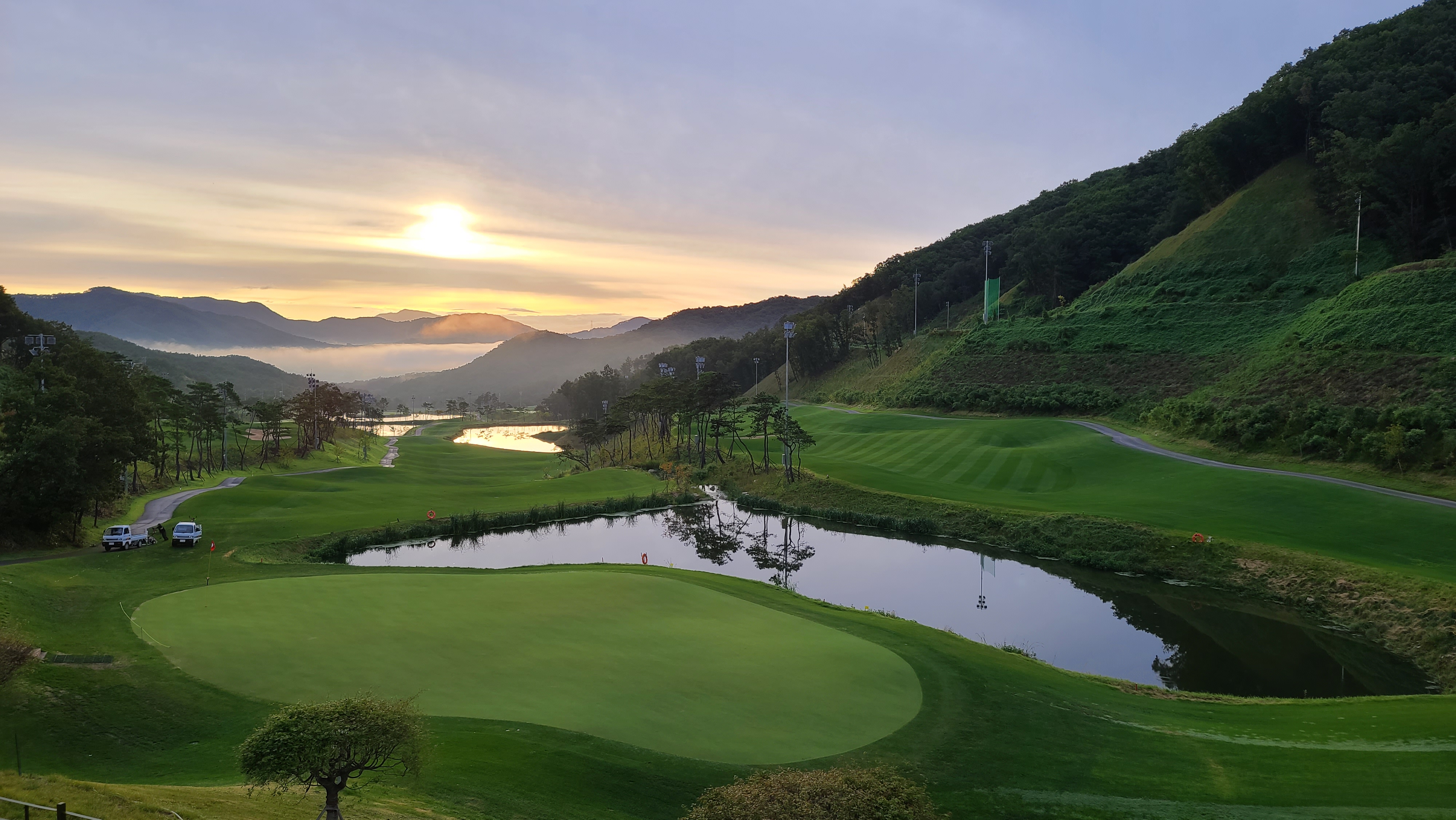 락커룸에서 환복을 하고 바깥을 바라보니 일출과 그린이 어우러져 한폭의 그림과 같은 풍경을 자야냅니다. 골프칠 맛이 나는 풍경에 감회가 새로워집니다.