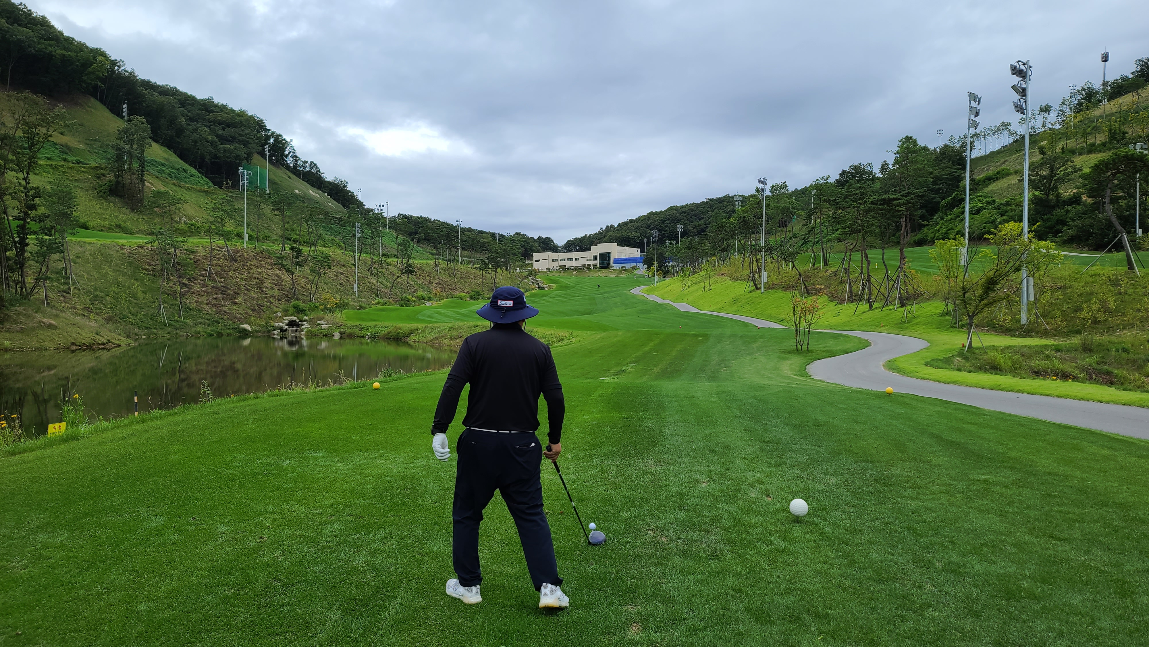 마지막 18번 파5홀입니다. 직선으로 뻗어있어 2온을 노릴 만도 하지만 그린앞에 워터해저드를 깔아놔서 끊어가도록 설계를 해놨습니다. 안전하게 플레이를 하여 유종의 미를 거둡니다.