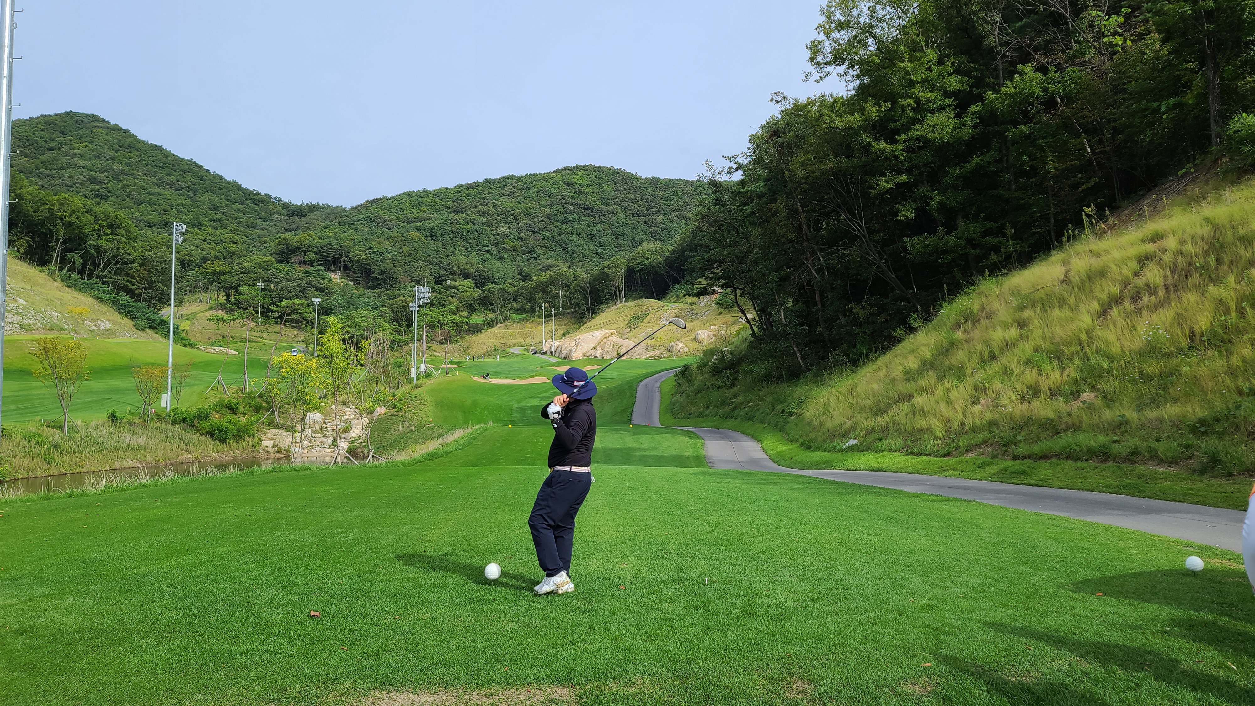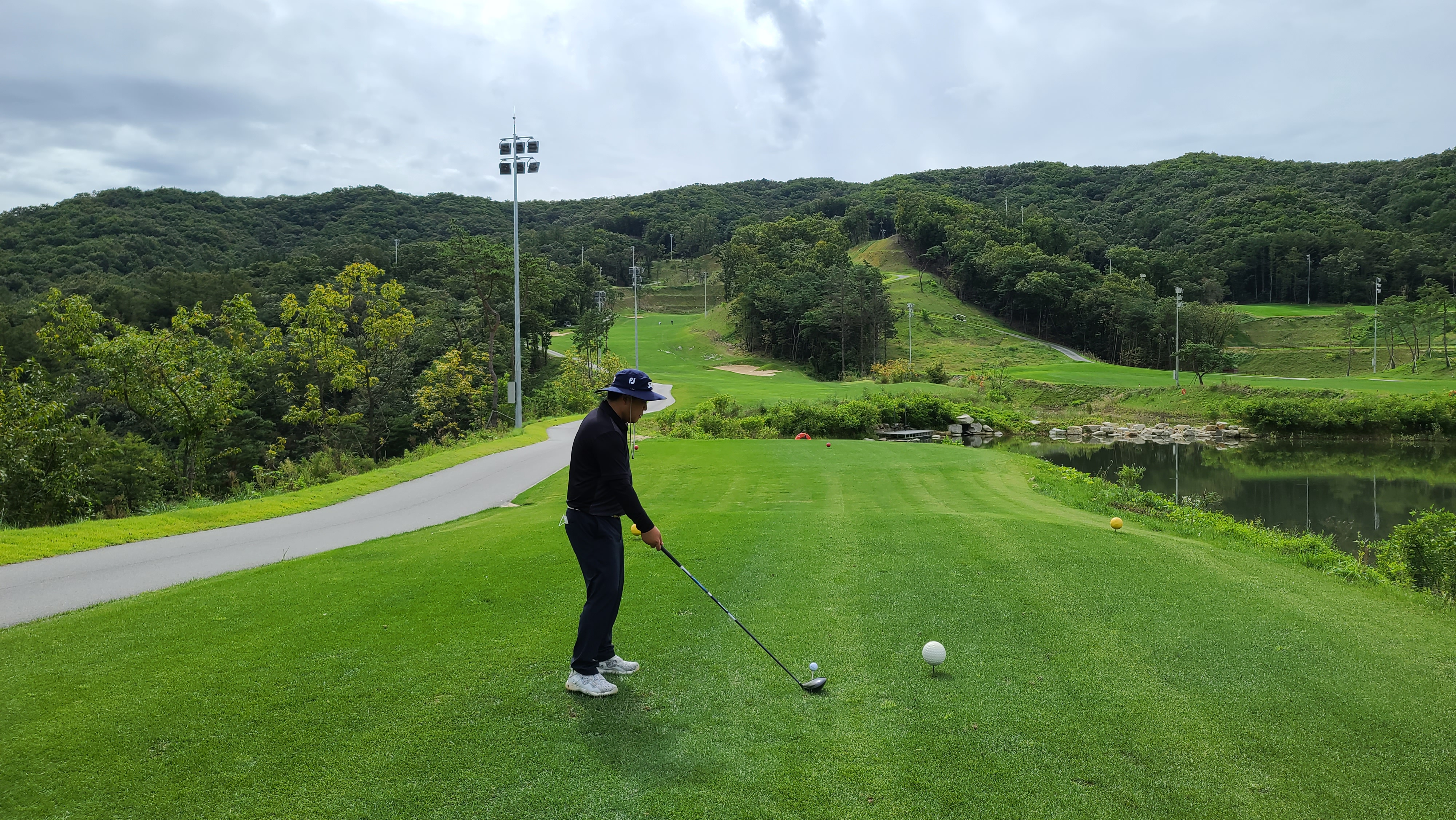 오른쪽이 공간이 없기 때문에 드로우 구질로 티샷을 공략합니다. 내리막이라 마음껏 휘두르면 드로우를 먹고 휘는것을 볼수가 있습니다.