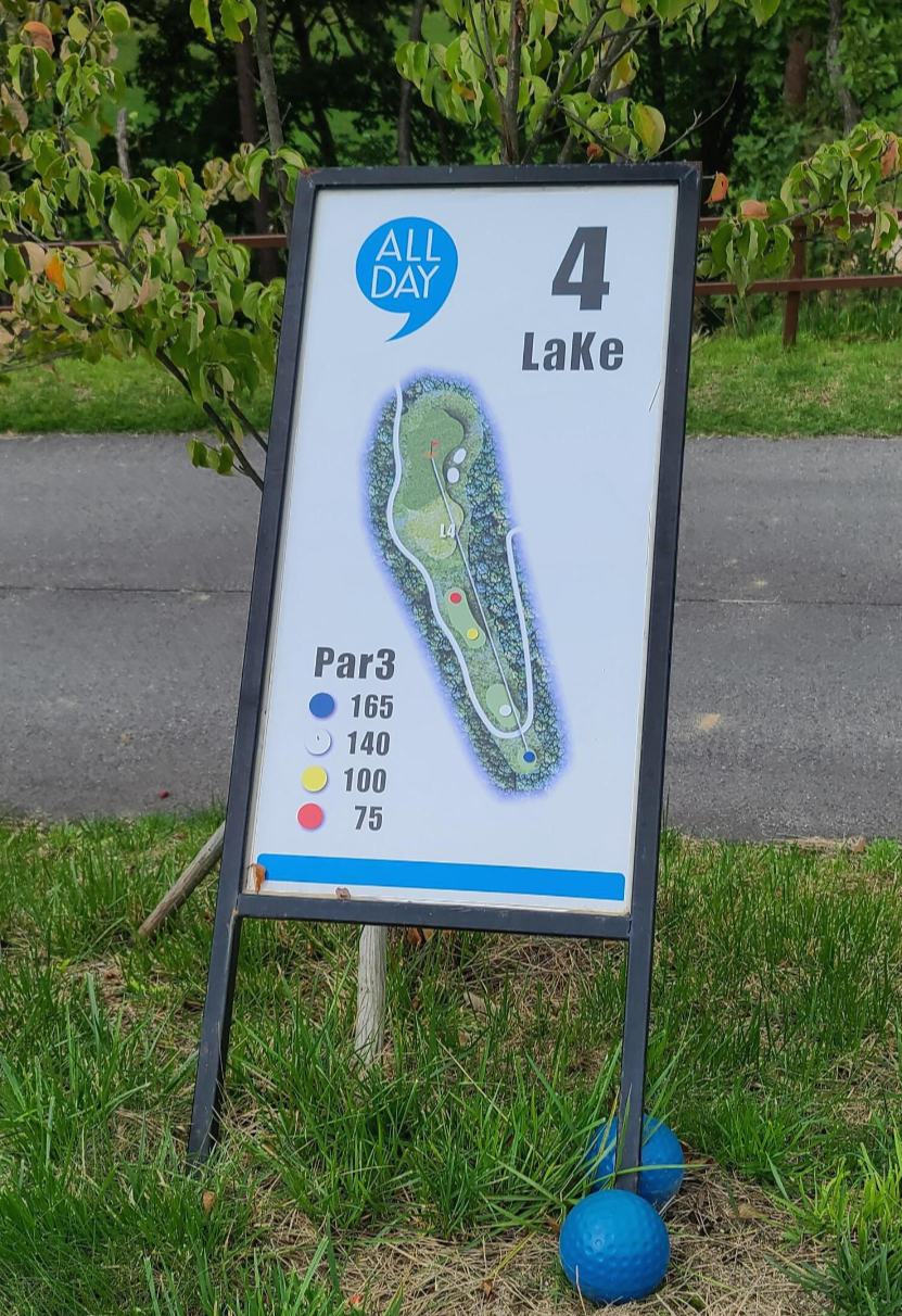 레이크 4번 파3홀입니다. 언덕형 코스로 프론트티와 레이디티의 차이가 파3에서 무려 70m 차이가 납니다. 올데이CC는 프론트티와 레이디티의 차이가 대부분 엄청나다고 생각하시면 됩니다.