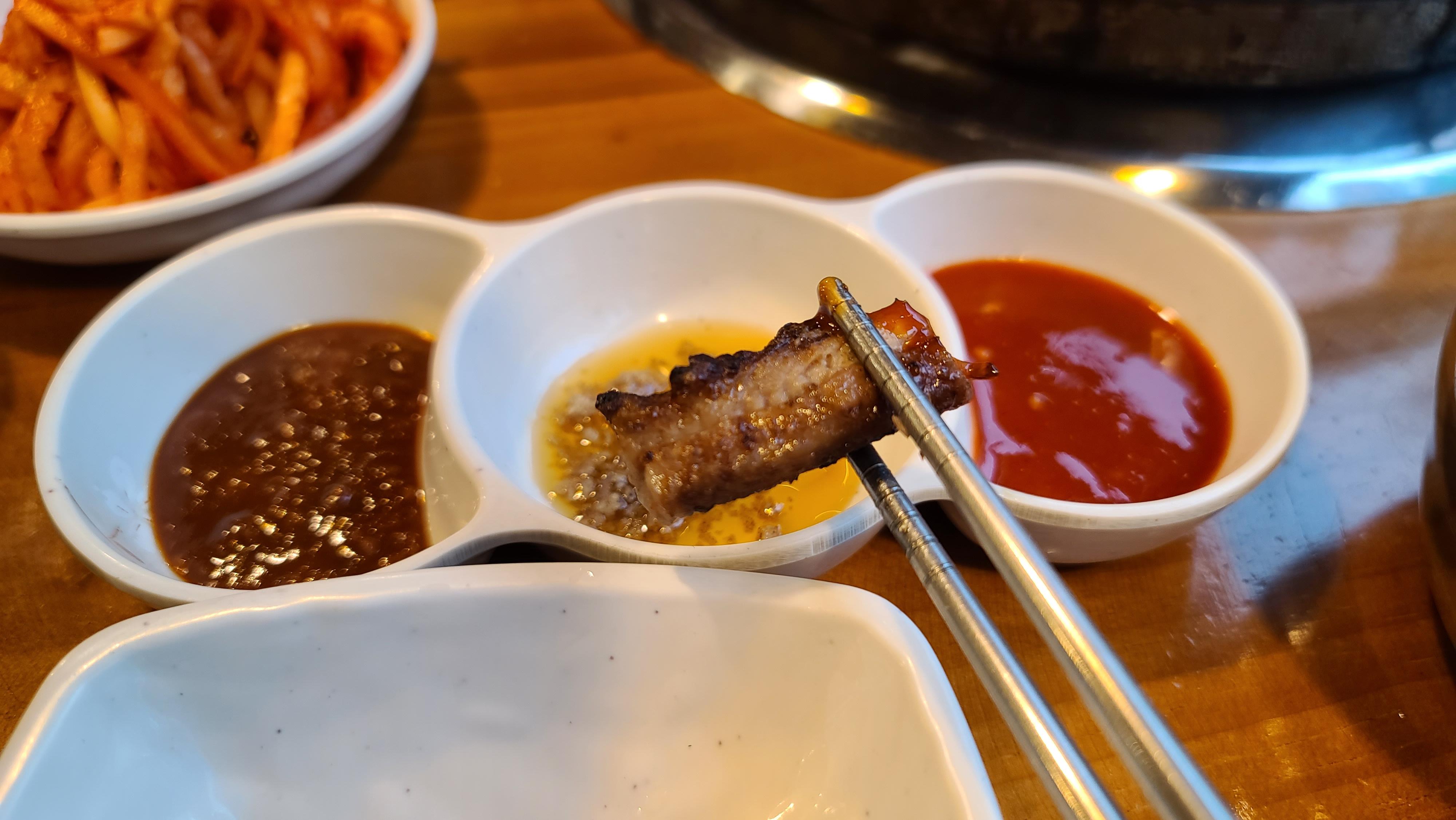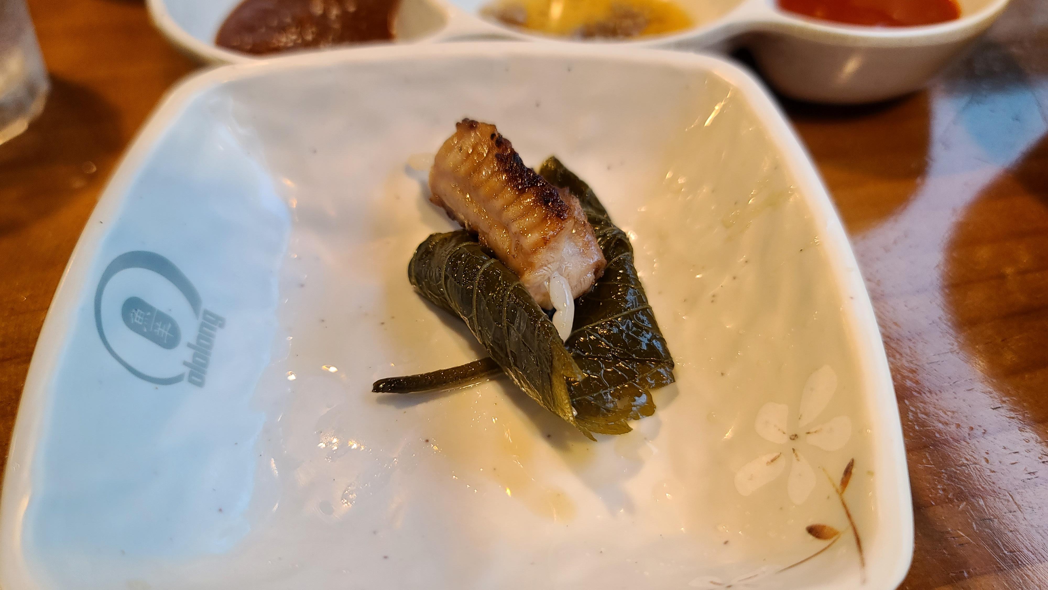 소금구이 꼼장어를 그냥도 먹어보고 기름장도 찍고, 초고추장도 찍고 깻잎도 싸서 다양하게 먹어봅니다. 숯불에 구워져 꼼장어가 겉바속촉 씹을수록 기름이 흘러나와서 매우 술과 좋은 안주가 되어버립니다.