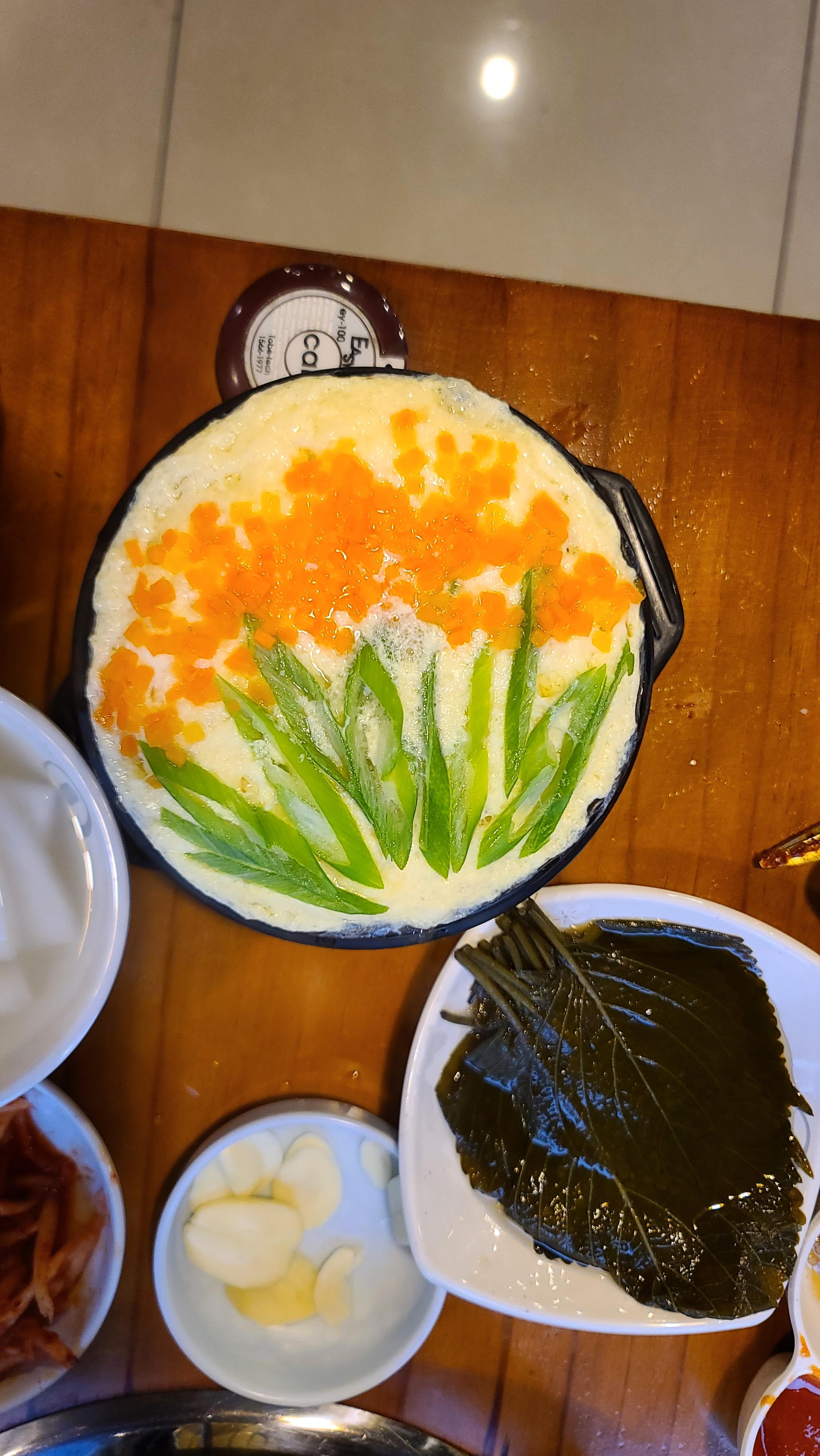 양념꼼장어를 먹다가 추가적으로 계란찜을 주문해봅니다. 계란찜의 비주얼을 보니 당근과 대파로 꽃밭을 표현해놓은 모습입니다. 센스있는 조리법에 계란찜이 더욱 맛있어보입니다.