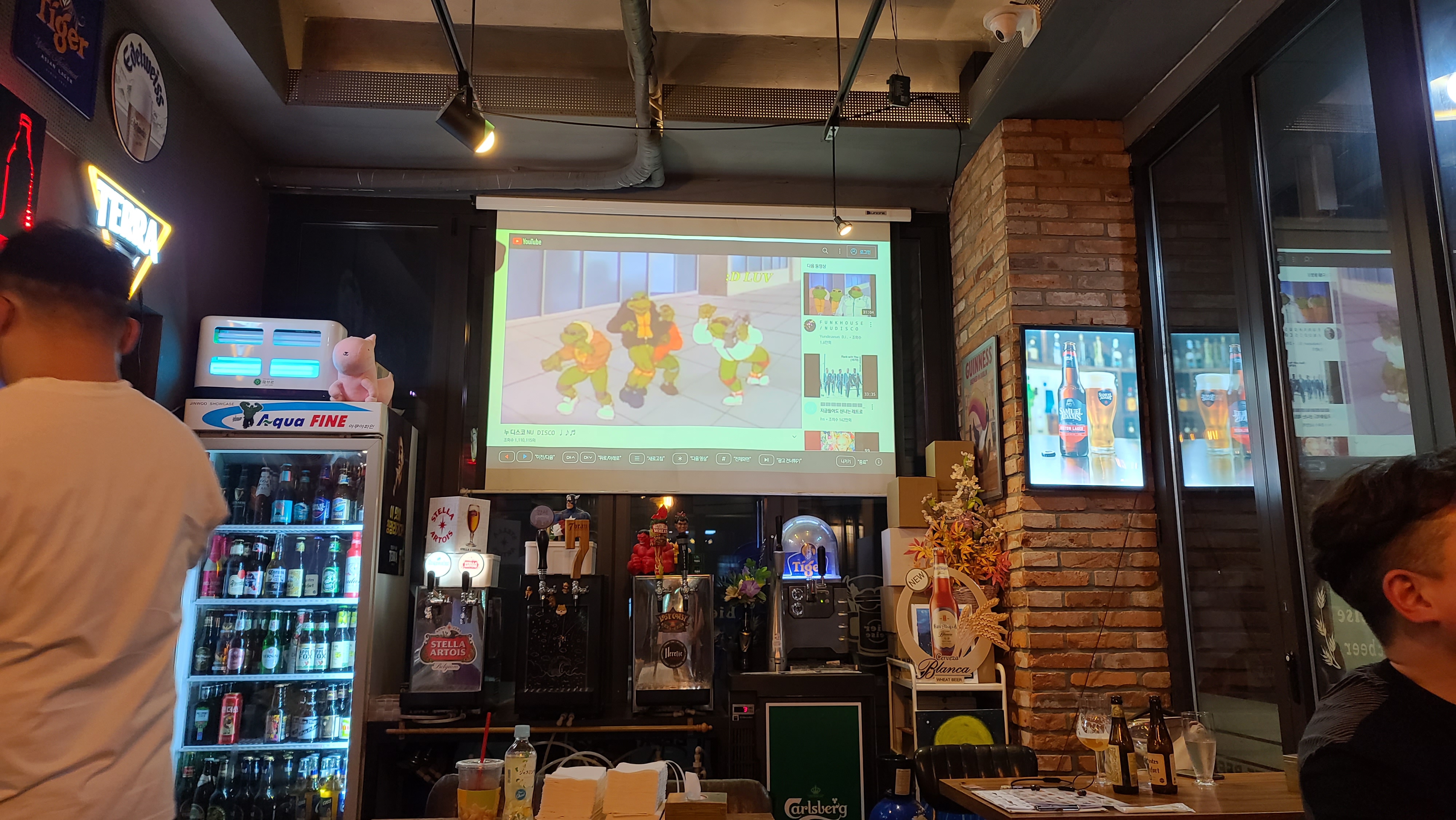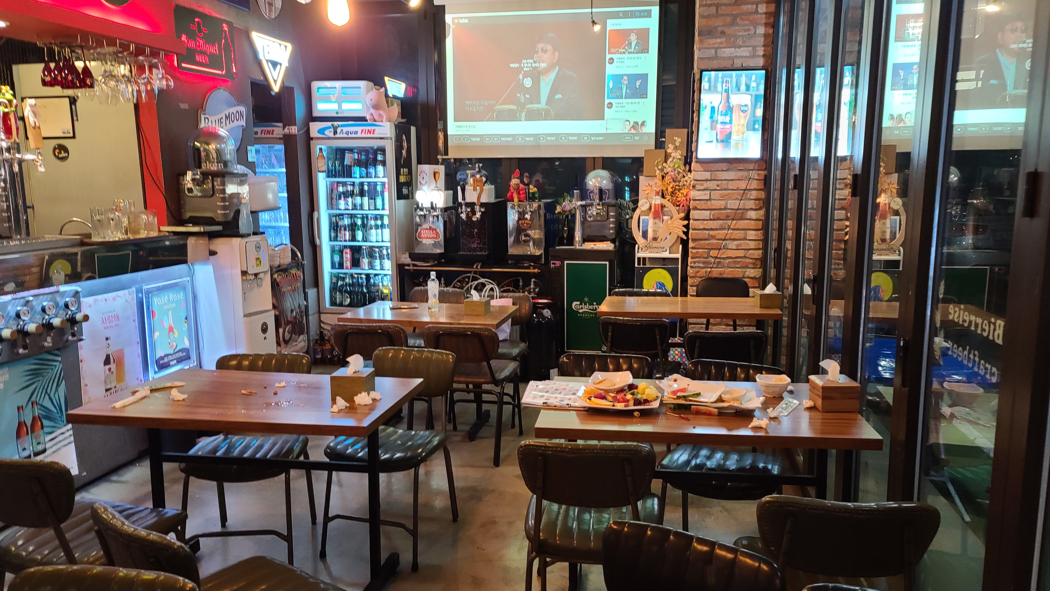안쪽에 자리를 잡고 무엇을 마실까 살펴봅니다. 카운터에 다양한 생맥기계를 보며 하나하나 골라봅니다.