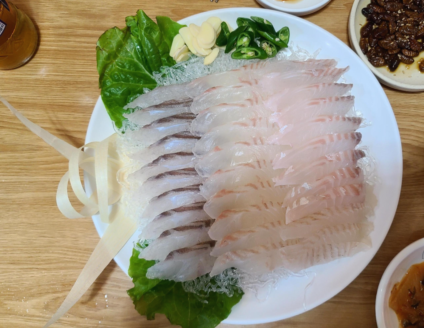 잠시 기다리자 밑반찬과 숙성회가 나왔습니다. 조촐하지만 언제나 찾게 만드는 마력을 지닌 메뉴구성입니다.