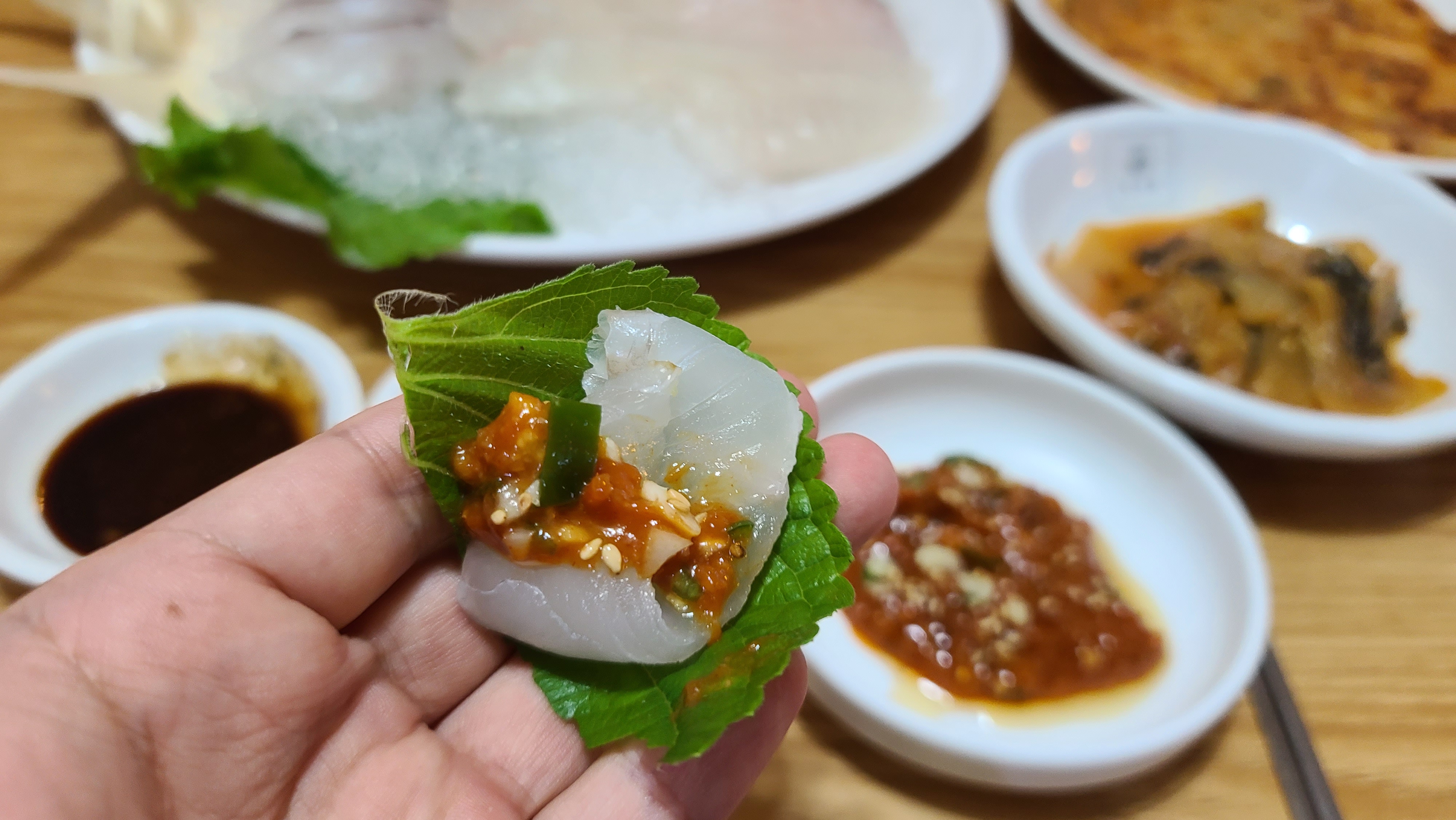 숙성회를 묵은지에도 깻잎과도 조합해서 먹어보며 다양한 맛을 음미해봅니다. 역시 오랜만에 와서 추억의 맛을 느끼니 기분이 좋아집니다.
