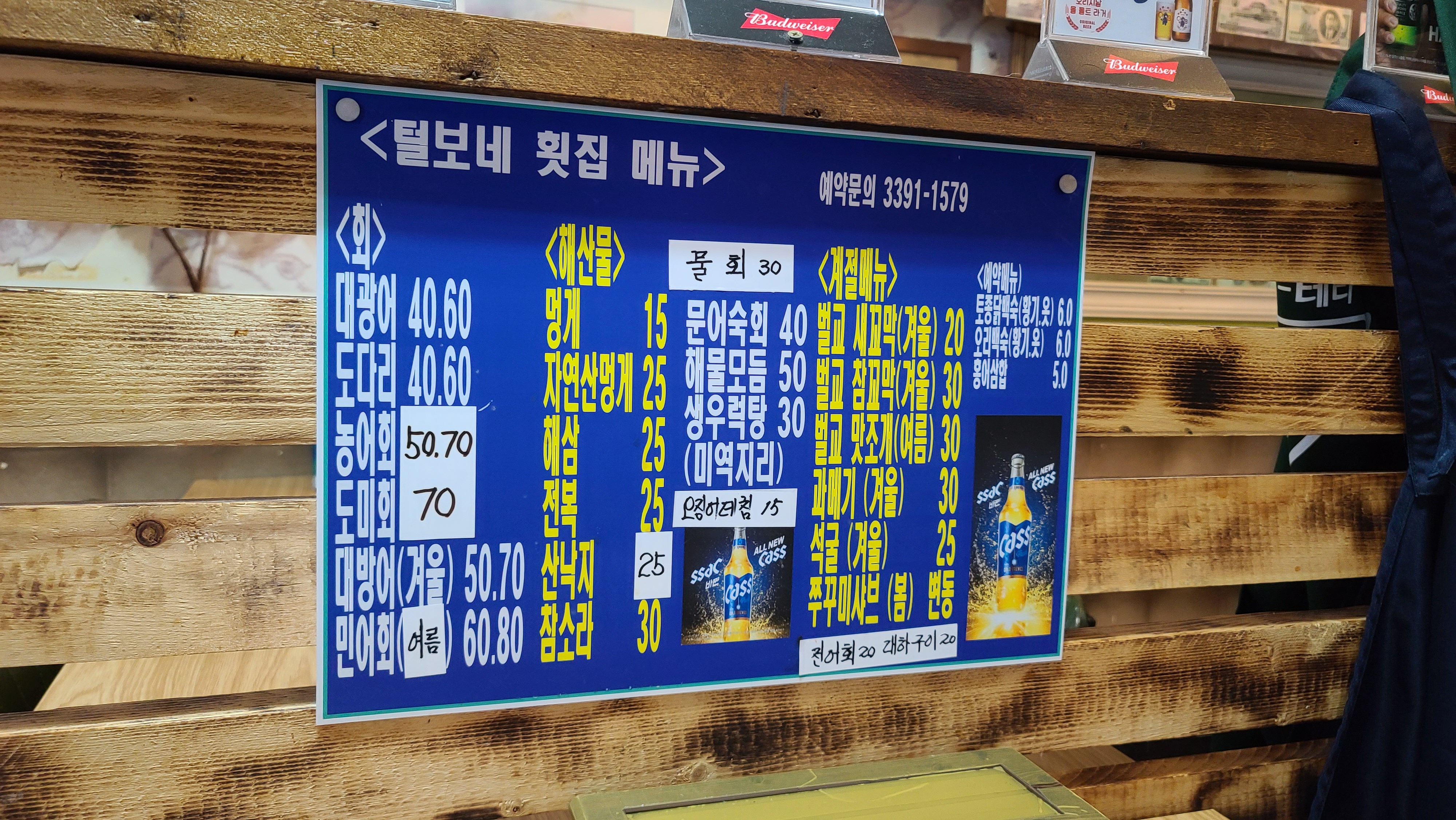 메뉴판을 보며 무엇을 먹을까 고민해봅니다. 맛조개가 무척 먹고싶어서 주문을 했지만 오늘 없다고 하십니다. 가슴이 아프지만 두번째 플랜으로 광어 숙성회를 먹기로 합니다.