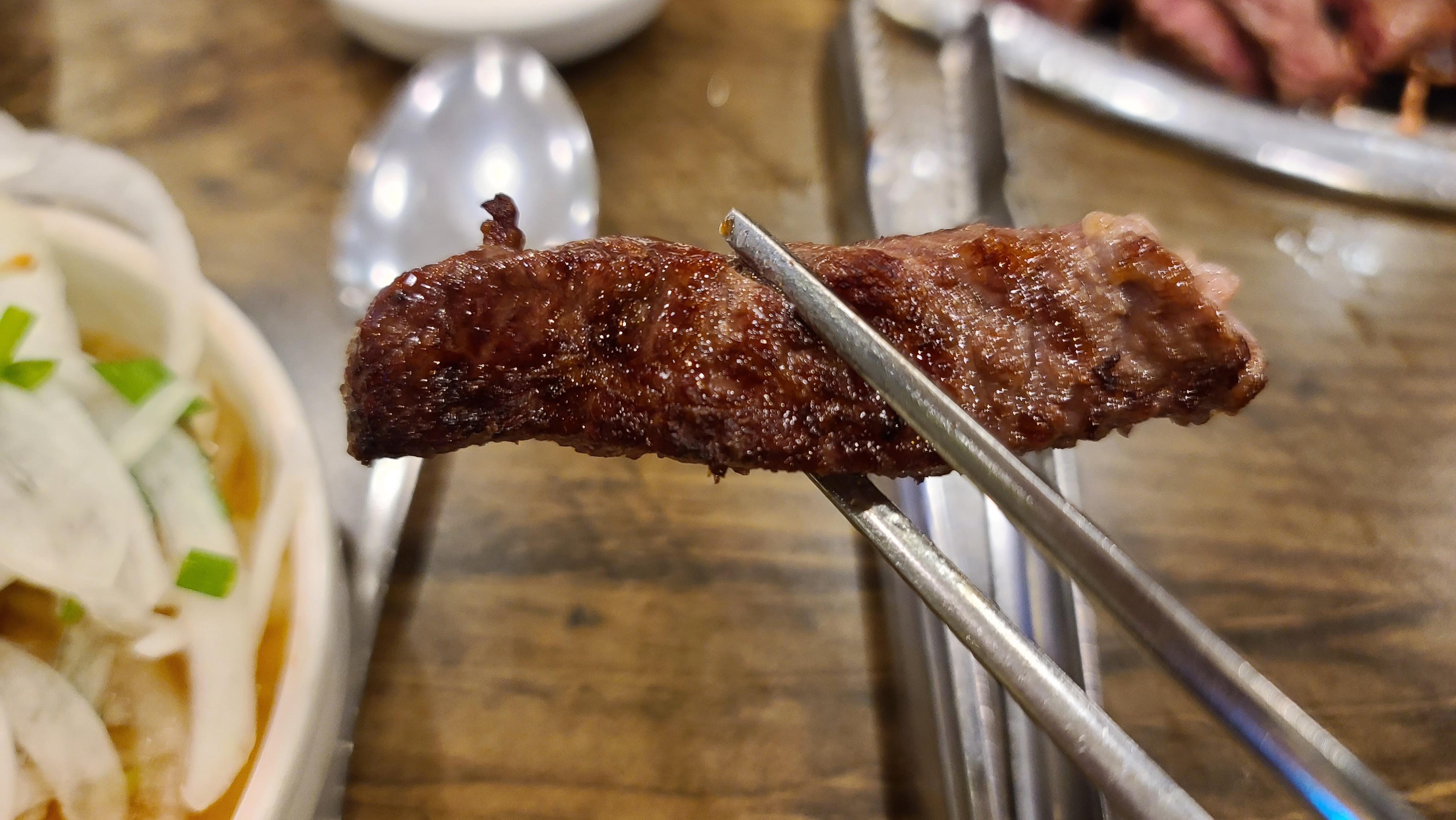 숯불의 화력으로 겉이 바싹익으면서도 속이 촉촉한 미디움 레벨의 소고기를 즐겨봅니다. 육즙이 넘쳐나는게 매우 맛있는 소고기입니다.