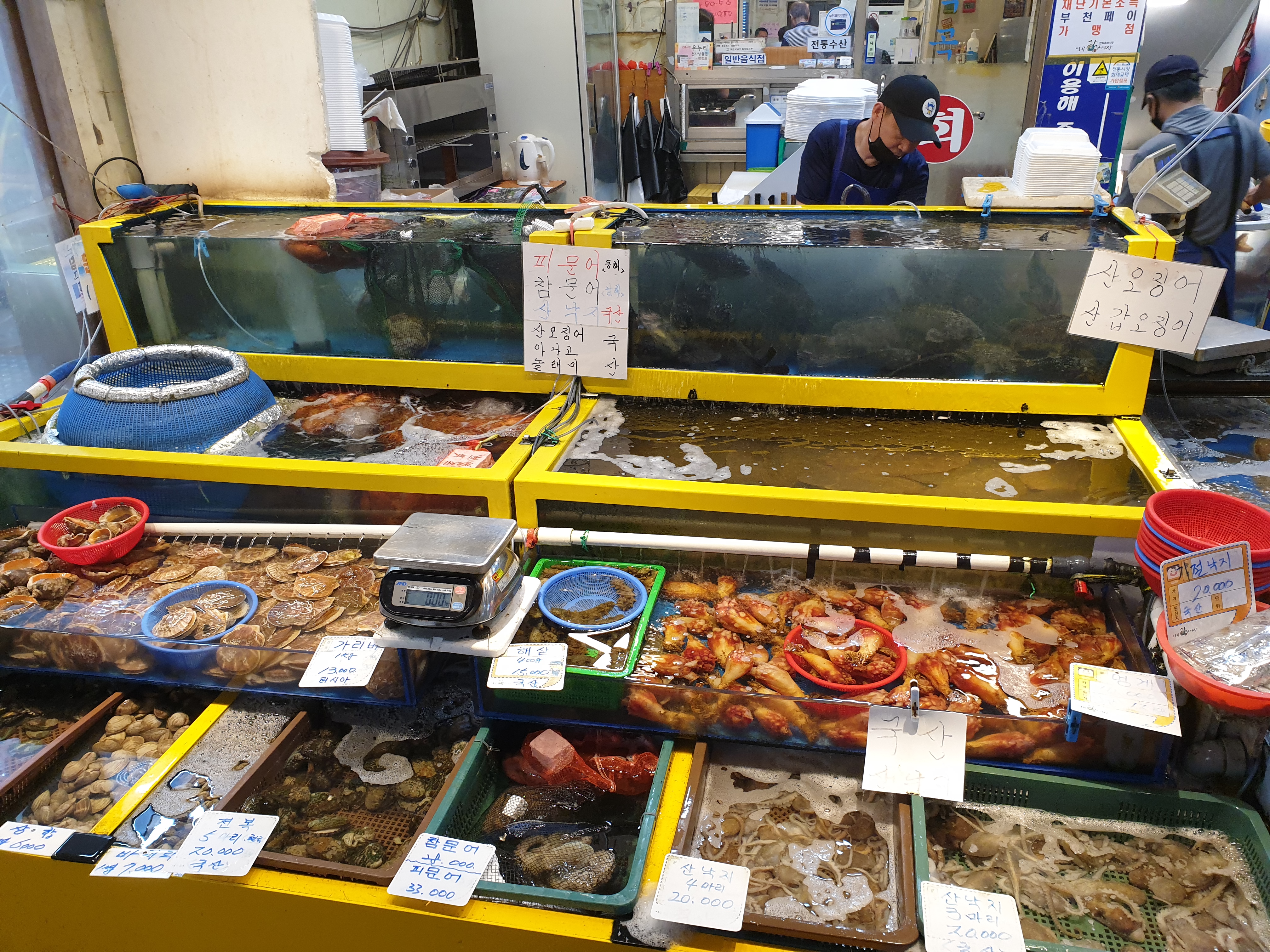 산낙지, 가리비, 멍게, 문어, 해삼, 소라, 전복 등 싱싱한 해산물이 수조에 가득합니다. 시장에서 둘러보니 보는즐거움도 가득합니다.