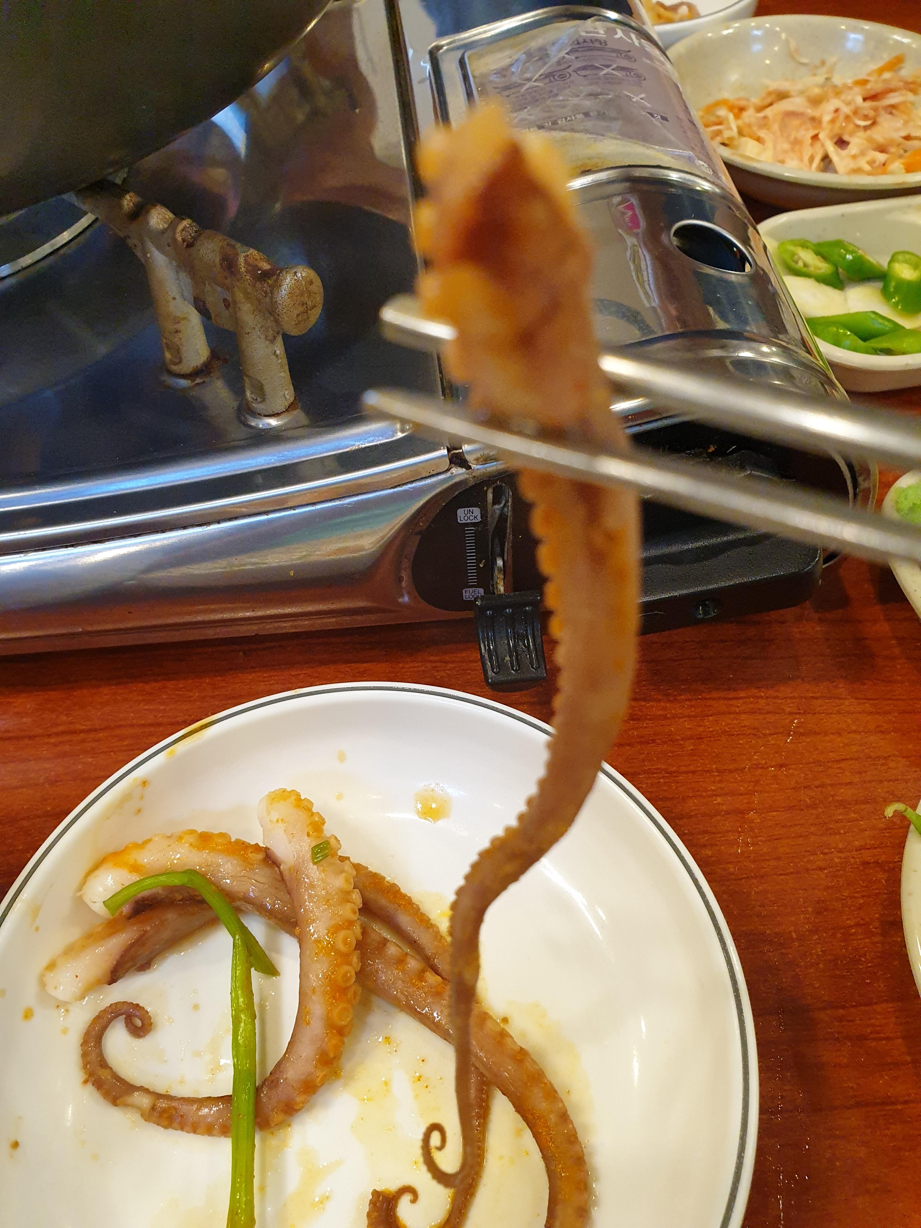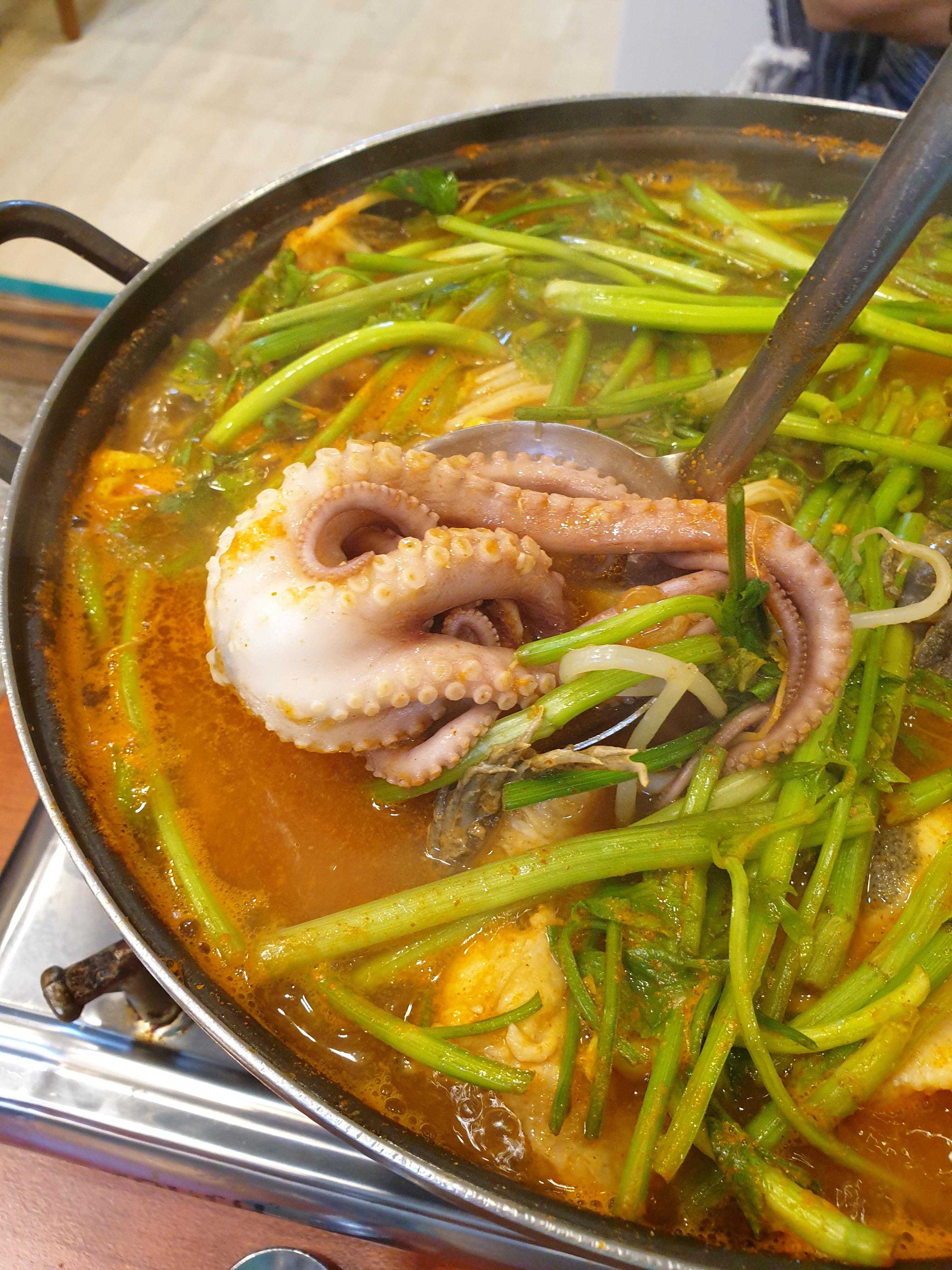 매운탕을 뒤적거리자 숨어있던 낙지가 나옵니다. 매운탕에 낙지도 넣어주시다니... 서비스가 매우 놀랍습니다.