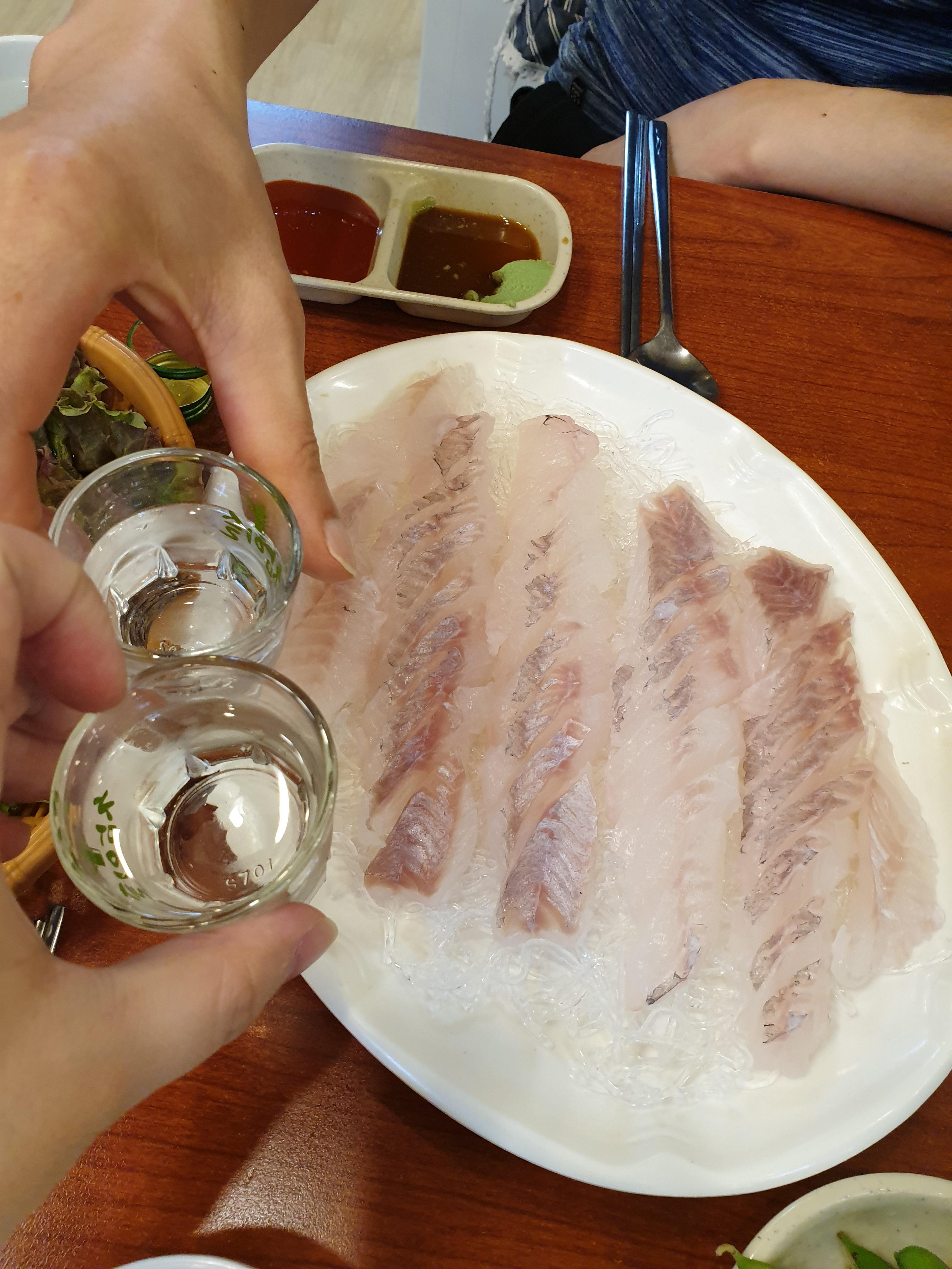 우럭회의 고소함과 탱글한 식감이 자연산이 맞다고 알려주고 있습니다. 등살쪽을 먹었을 뿐인데도 진한 지방맛이 스며나오고 아울러 바다에 단련된 탱탱한 살의 식감이 입안에서 계속됩니다.