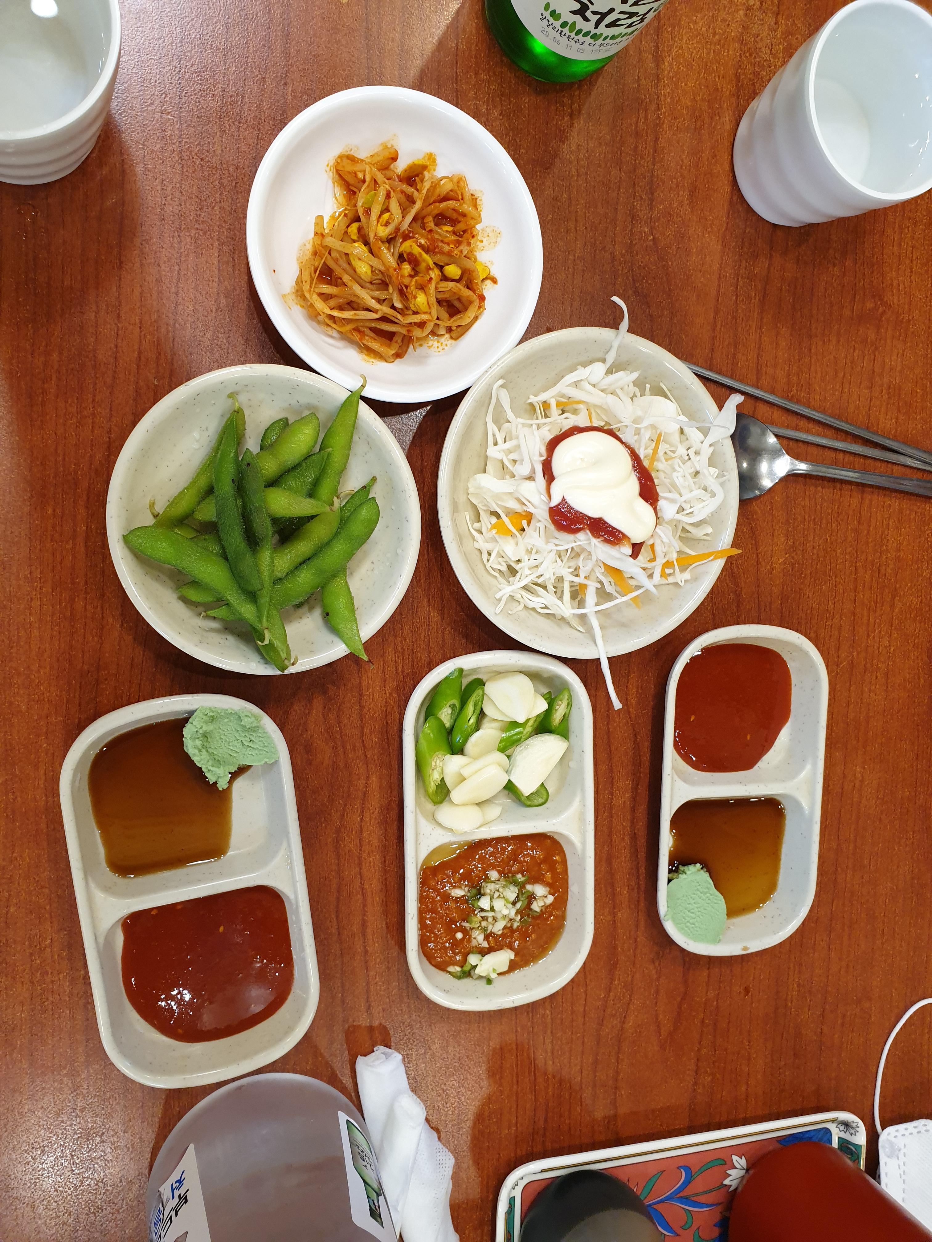 회를 주문하고 안에 준비된 가게에 들어가자 기본 반찬을 주시는데 소박합니다. 전통시장의 향취라고 긍정적으로 생각하고 넘어갑니다.