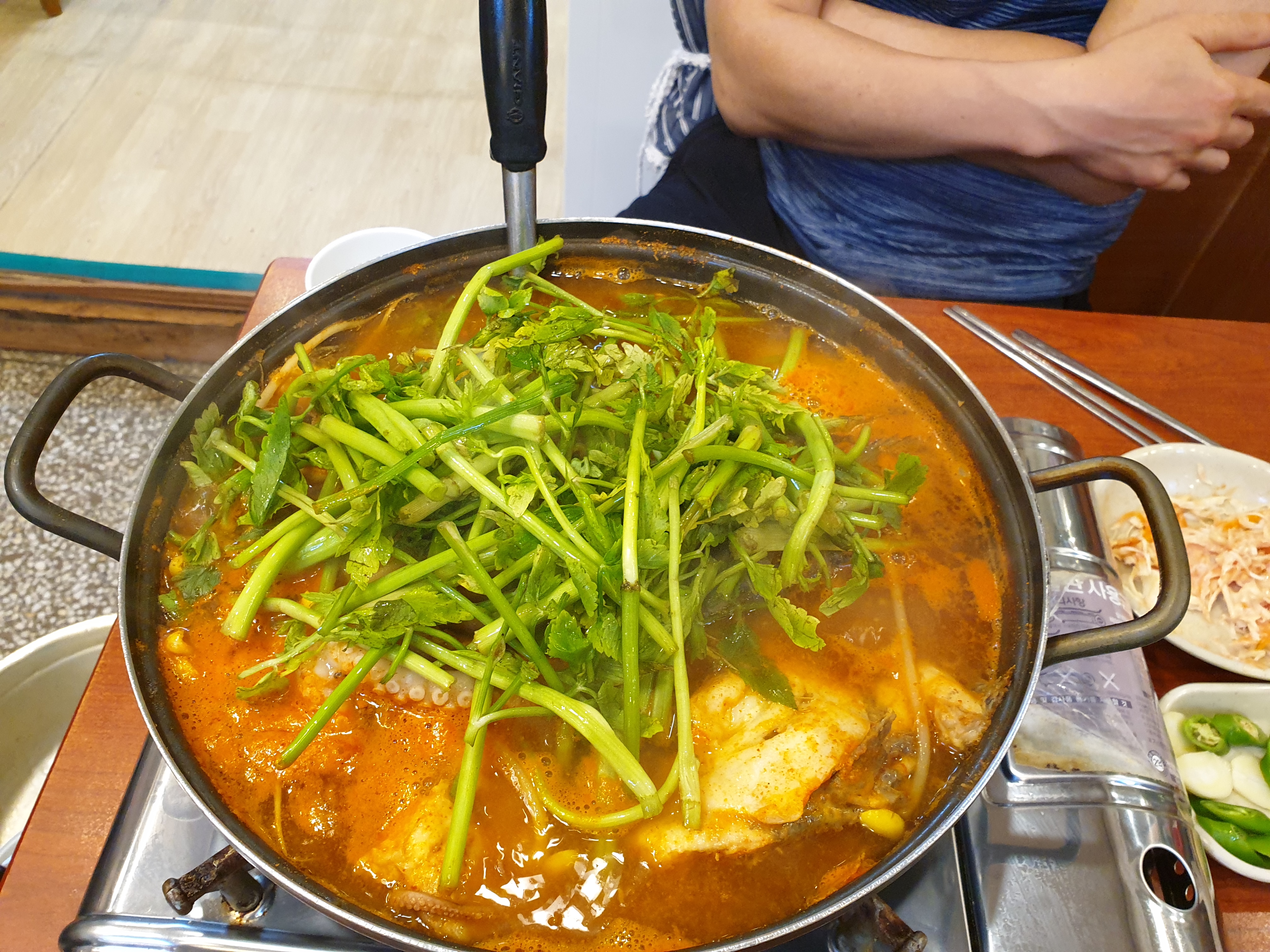 회를 맛있게 먹고 매운탕을 주문합니다. 매운탕에 미나리가 한가득 올라가 있는것이 좋은향을 내고 있습니다.