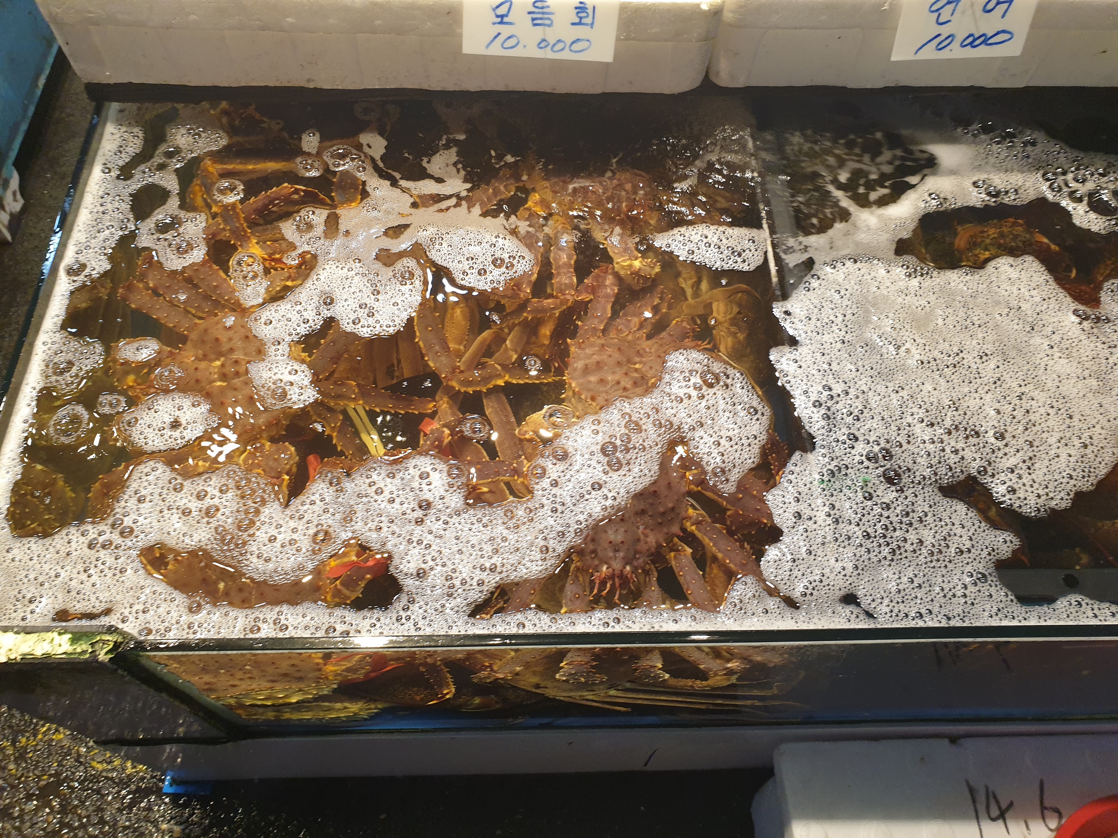 요즘은 대게가 싸다고 하던데 갑각류 수조를 보니 대게는 많이 나가고 킹크랩은 가득차있는 모습이 보이는것 같습니다. 역시 수산물은 시세가 있어서 가격에 따라 수요가 많이 결정되는것 같습니다.