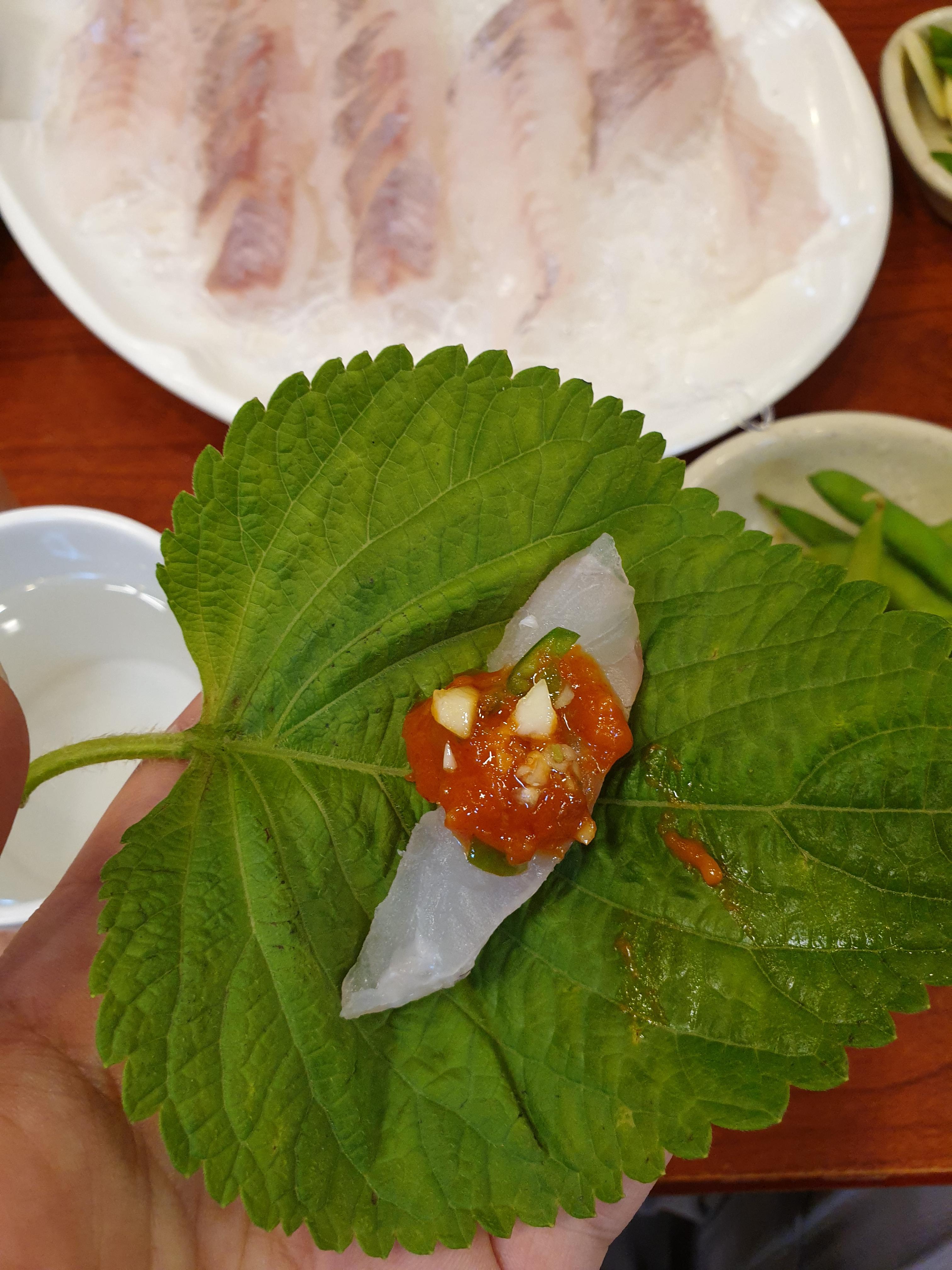 요번에는 이 자연산 우럭 한점을 깻잎에 쌈장과 싸서 먹어봅니다. 탱탱한 식감때문에 쌈이 더욱 빛이 나는것 같습니다.