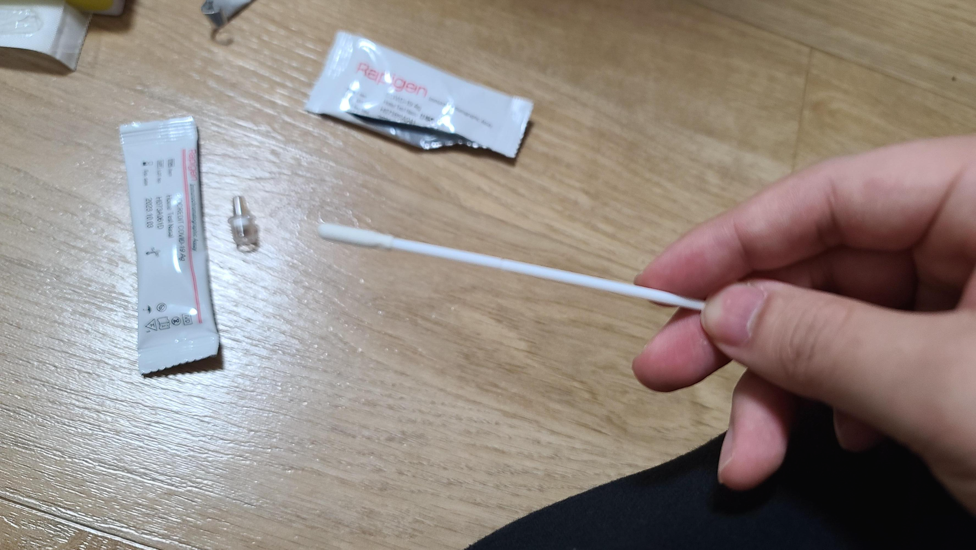 첫단계로 면봉을 준비하여 콧구멍(비강)으로 깊숙이 넣어 돌려줘서 체액을 충분히 묻혀줘야 합니다. 충분히 깊숙히 찔러서 묻혀주는 작업이 테스트의 정확도를 좌우하는 작업이기 때문에 거부감이 들더라도 코에서 찡한 느낌이 들때까지 찔러줘야 하며 자신이 없다면 다른사람에게 부탁들하는 것도 고려하여야 합니다.