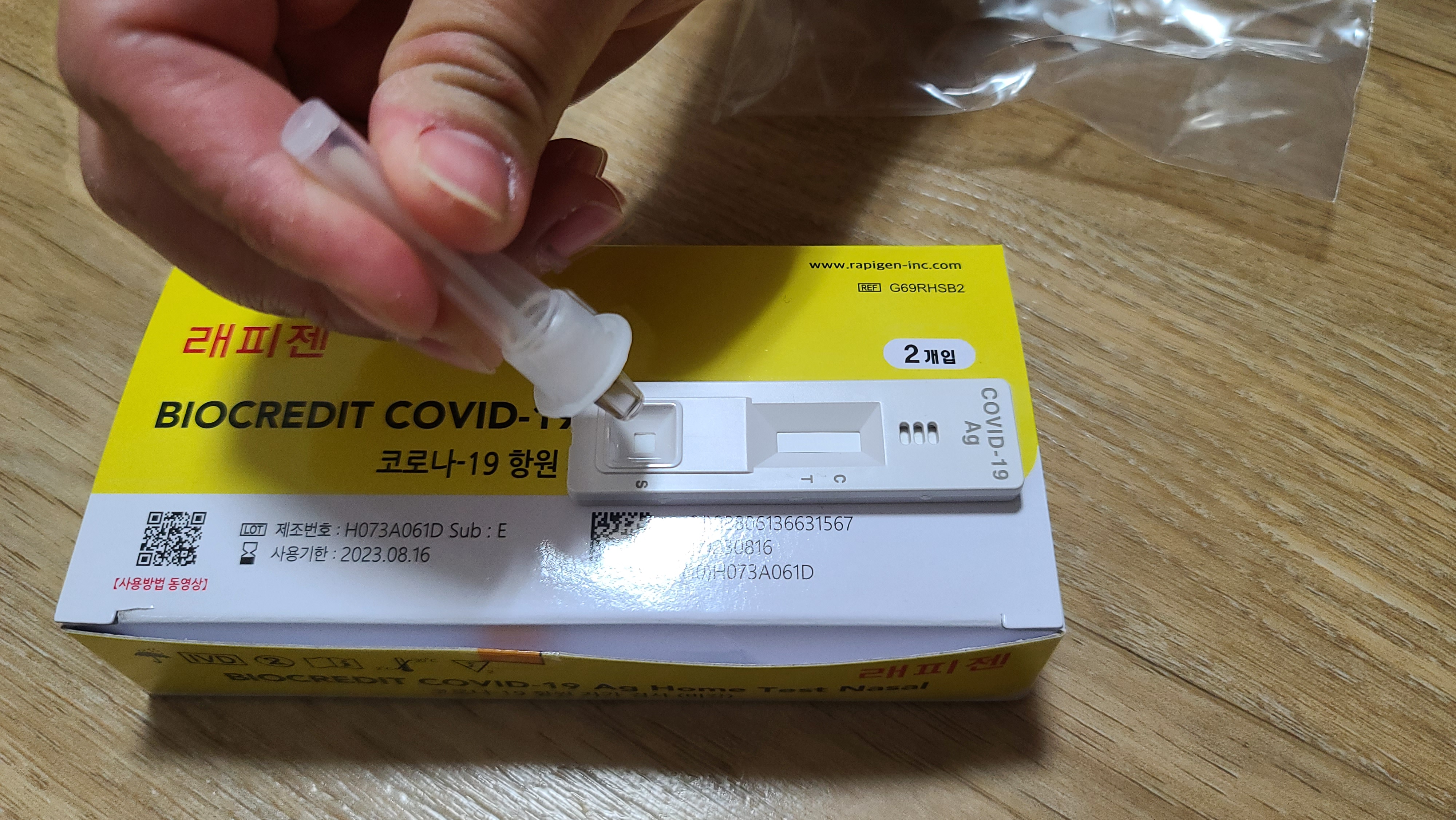 충분히 흔들어서 섞여진 검체추출액은 케이스 혹은 고정대에 꽂아서 잠시 놓아둡니다. 그사이 테스트기를 준비하여 시약을 떨어뜨릴 준비를 하면됩니다.