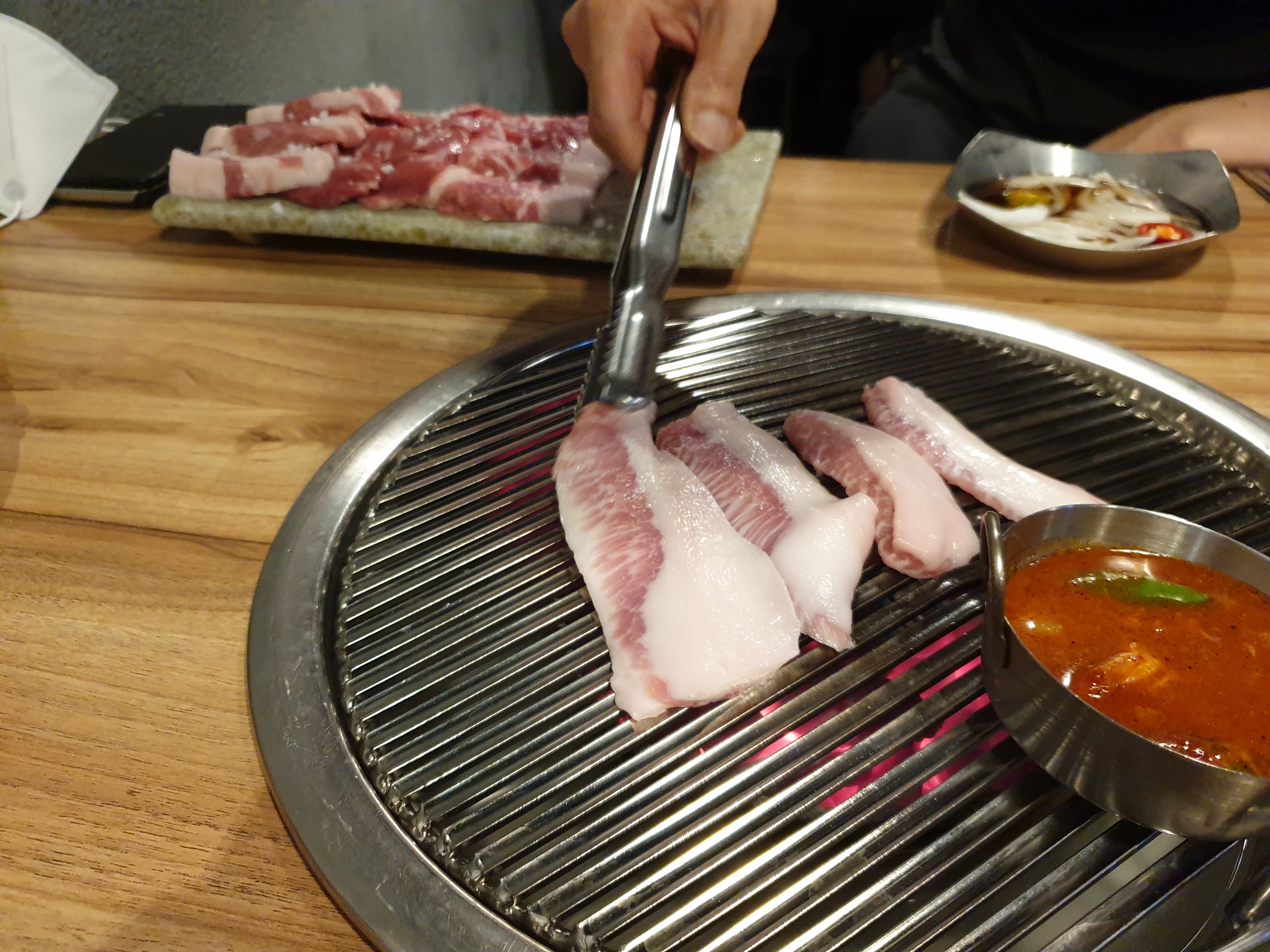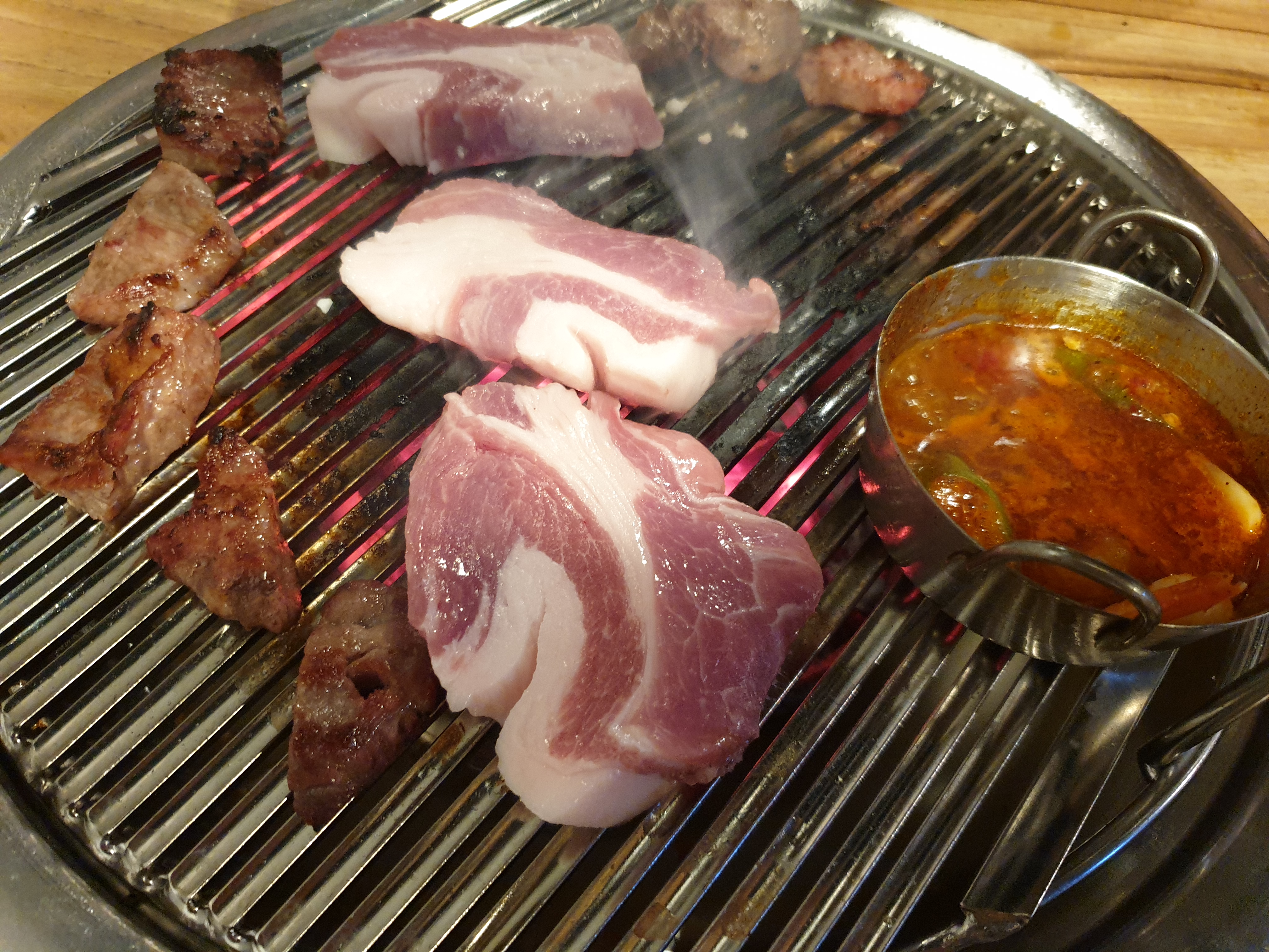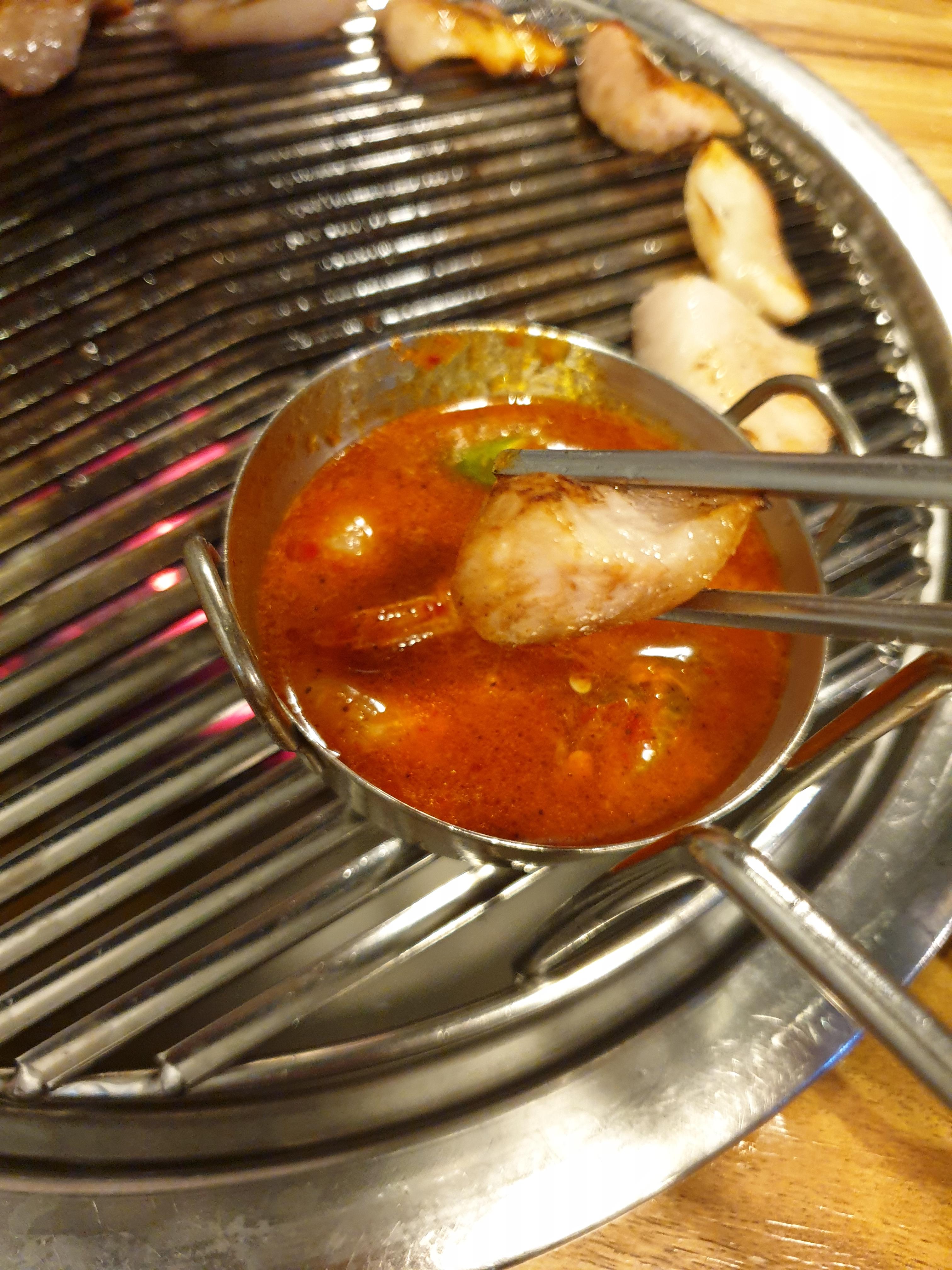 불판위에 가게추천대로 흰살부터 구워봅니다. 불판위에 새우액젓은 핵심소스로서 돼지고기의 맛을 몇배로 끌어올려줍니다.