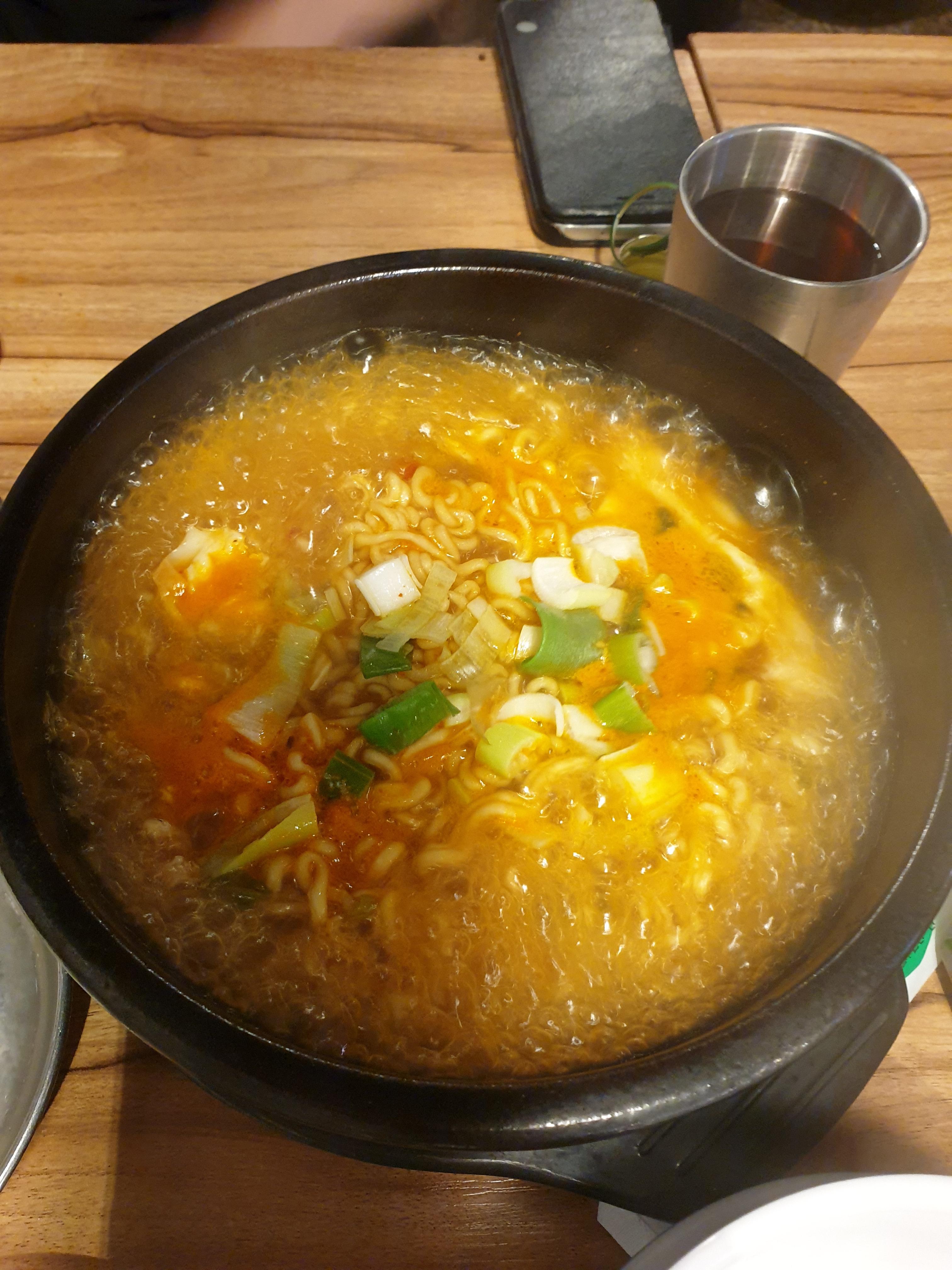 후식으로 시킨 땡초라면이 나왔습니다. 안성탕면을 정말 맛있게 끓여냈습니다. 꼬들한 면뒤에 매콤한 국물이 돼지고기를 먹은후 기름기를 씻어주는것 같고 맛의 변화와도 매우 어울립니다.