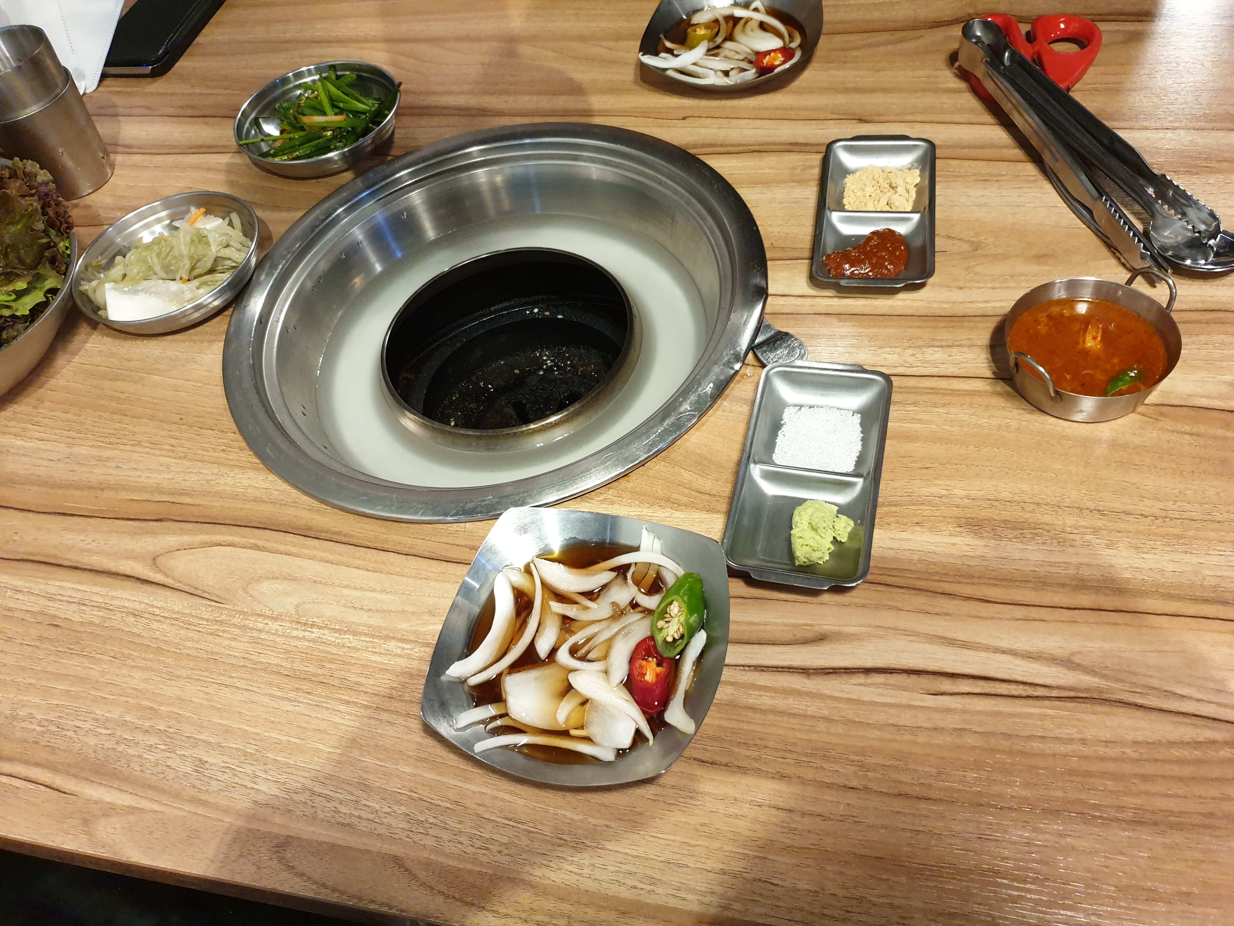 모듬반판을 주문하고 자리에 앉자 기본적인 상차림이 세팅이 됩니다. 양파와소스, 와사비와 소금, 쌈장과 콩가루, 백김치와 부추 그리고 핵심 새우액젓입니다.