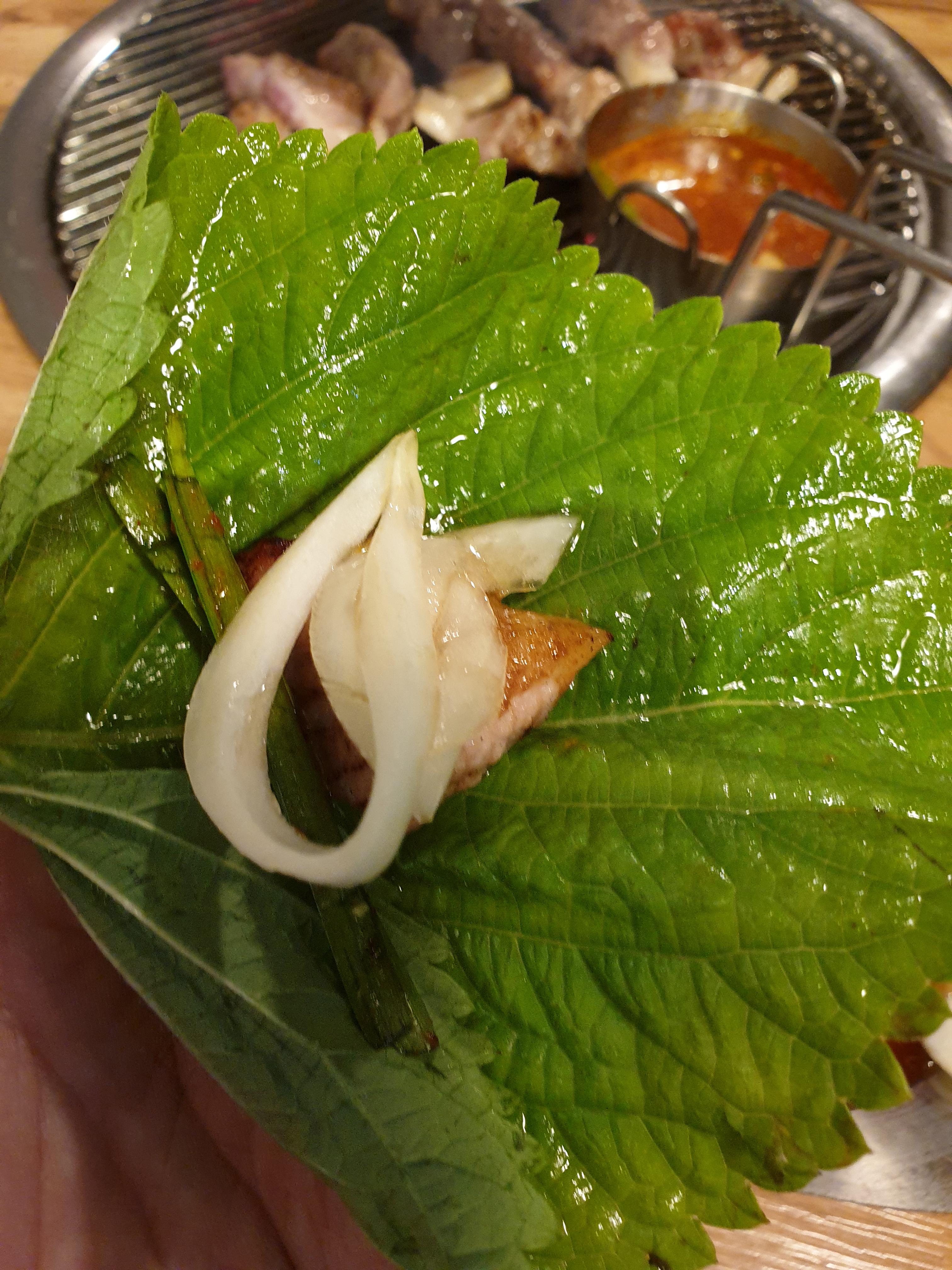 구워진 고기를 깻잎에 얹어 양파와 부추도 같이 싸서 맛을 봅니다. 야채가 어우러지니 고기는 또 새로운 맛이 납니다.