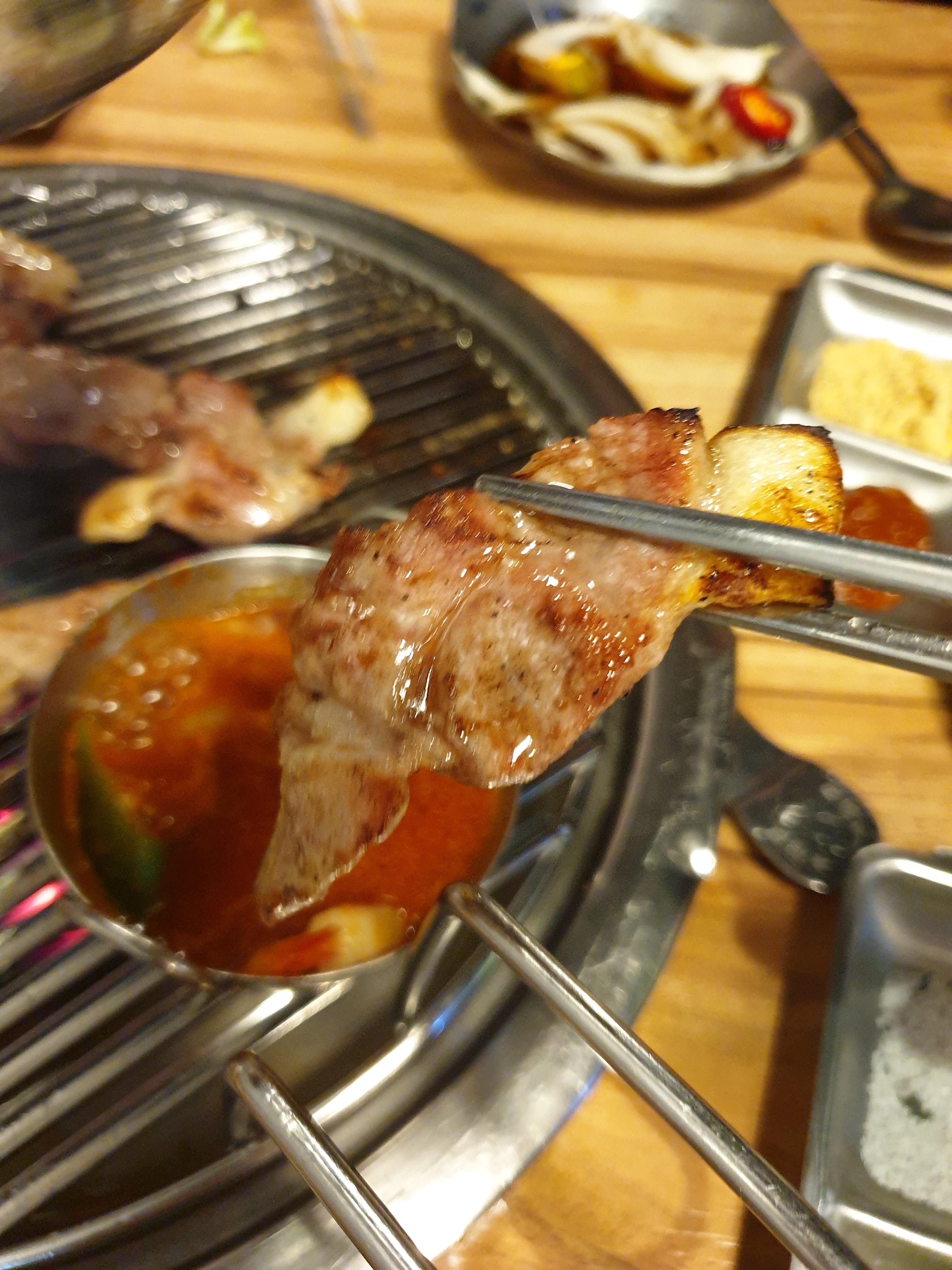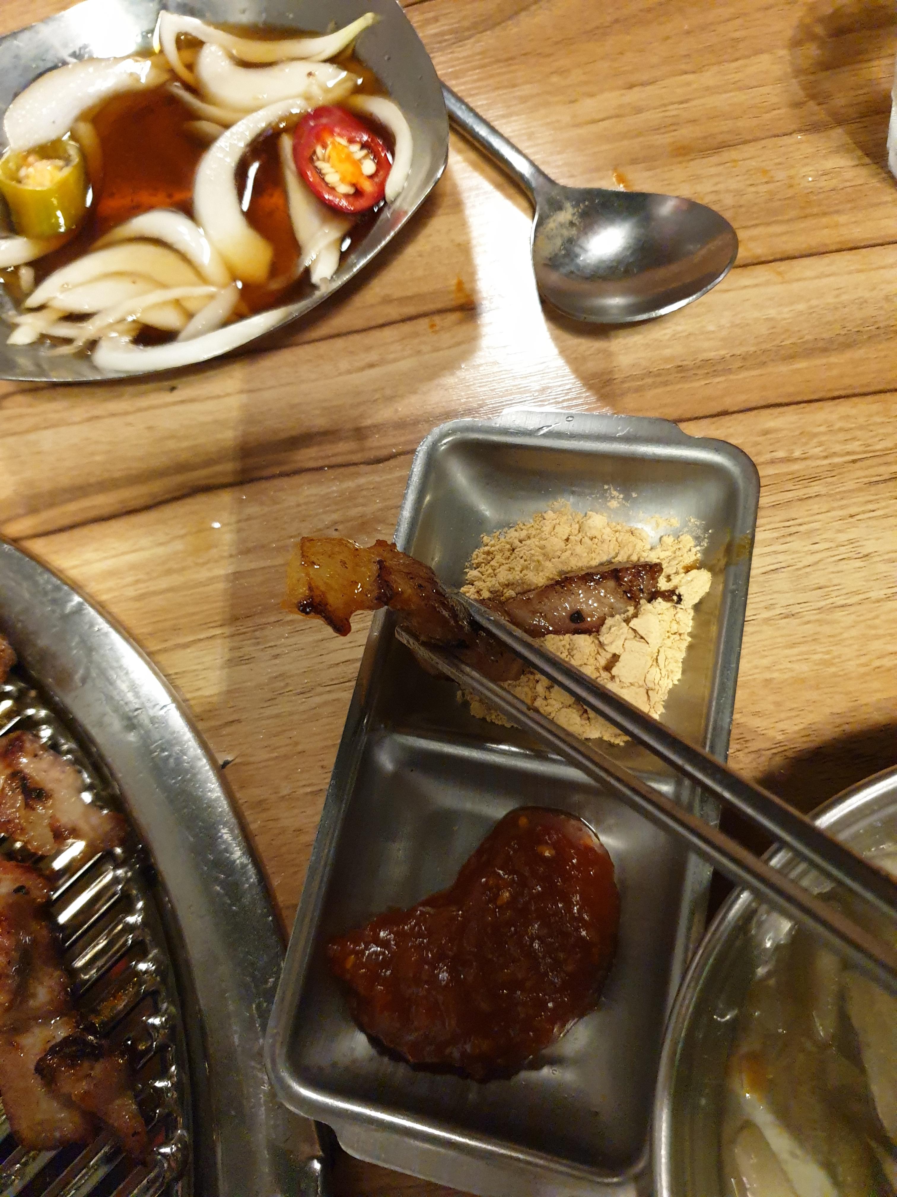 첫번째 고기가 구워졌습니다. 말한대로 새우액젓에 찍어 맛을 봅니다. 새우액젓의 감칠맛이 고기에 스며들어 고기의 맛을 몇배나 끌어올려줍니다. 어떻게 이런걸 생각해냈나 모르겠습니다.