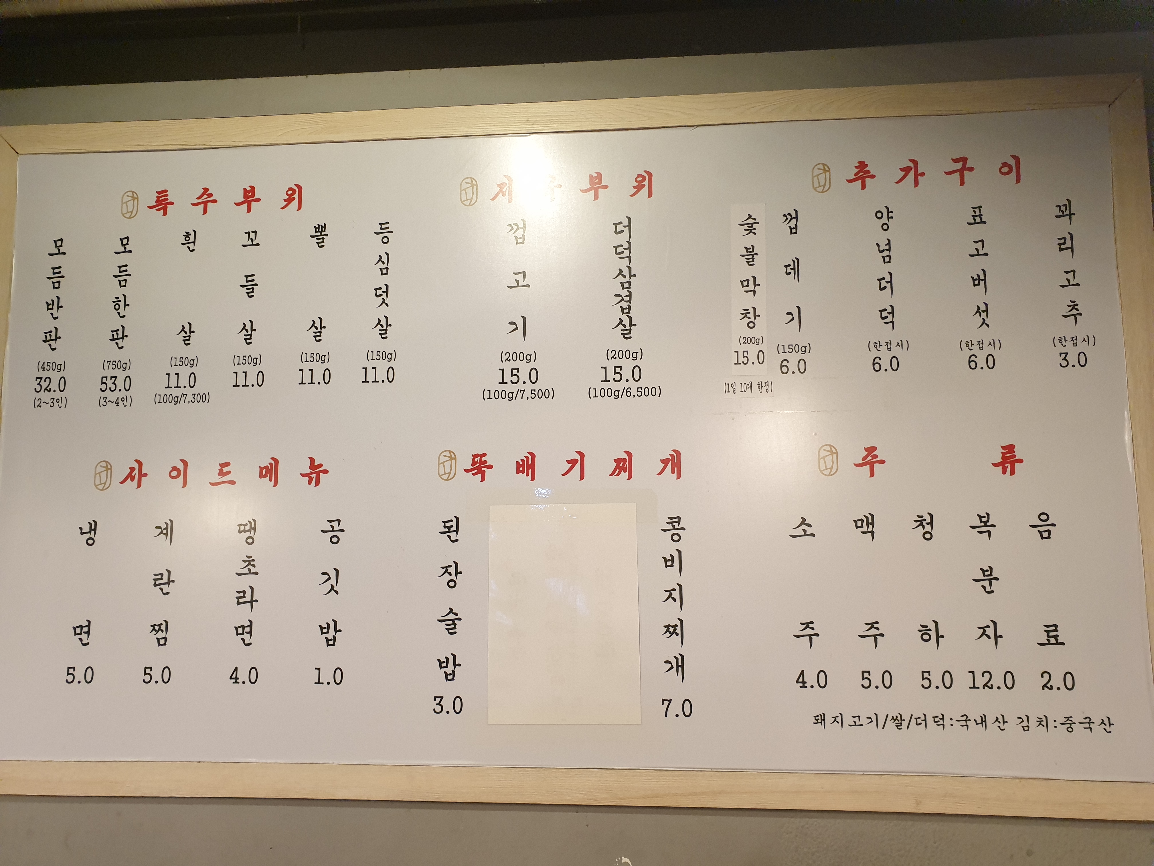 들어가서 메뉴판을 사진에 담아봅니다. 흰살, 꼬들살, 뽈살, 등심덧살의 특수부위가 이 체인점의 핵심고기 부위이며 이것들을 모아서 나오는 메뉴가 모듬한판, 반판 시리즈입니다. 그외 껍데기가 붙어있는 껍고기, 더덕삼겹살, 양념더덕, 막창 등의 메뉴도 자주 보일정도로 꾸준히 주문히 나오고 냉면, 계란찜, 땡초라면 등 모든 메뉴가 대체로 맛있는 집입니다.