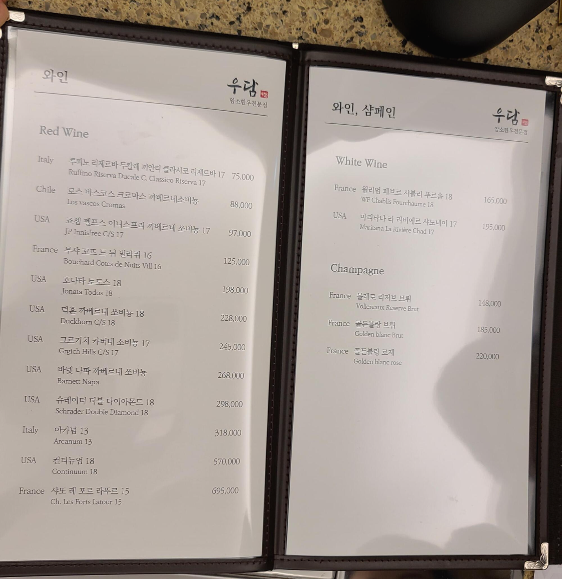 자리를 잡고 메뉴판을 살펴보니 다양한 레드, 화이트, 샴페인이 눈에 들어옵니다. 소고기를 먹으면서 차례대로 비교시음 해보기로 하고 소고기와 샴페인을 먼저 주문해봅니다.
