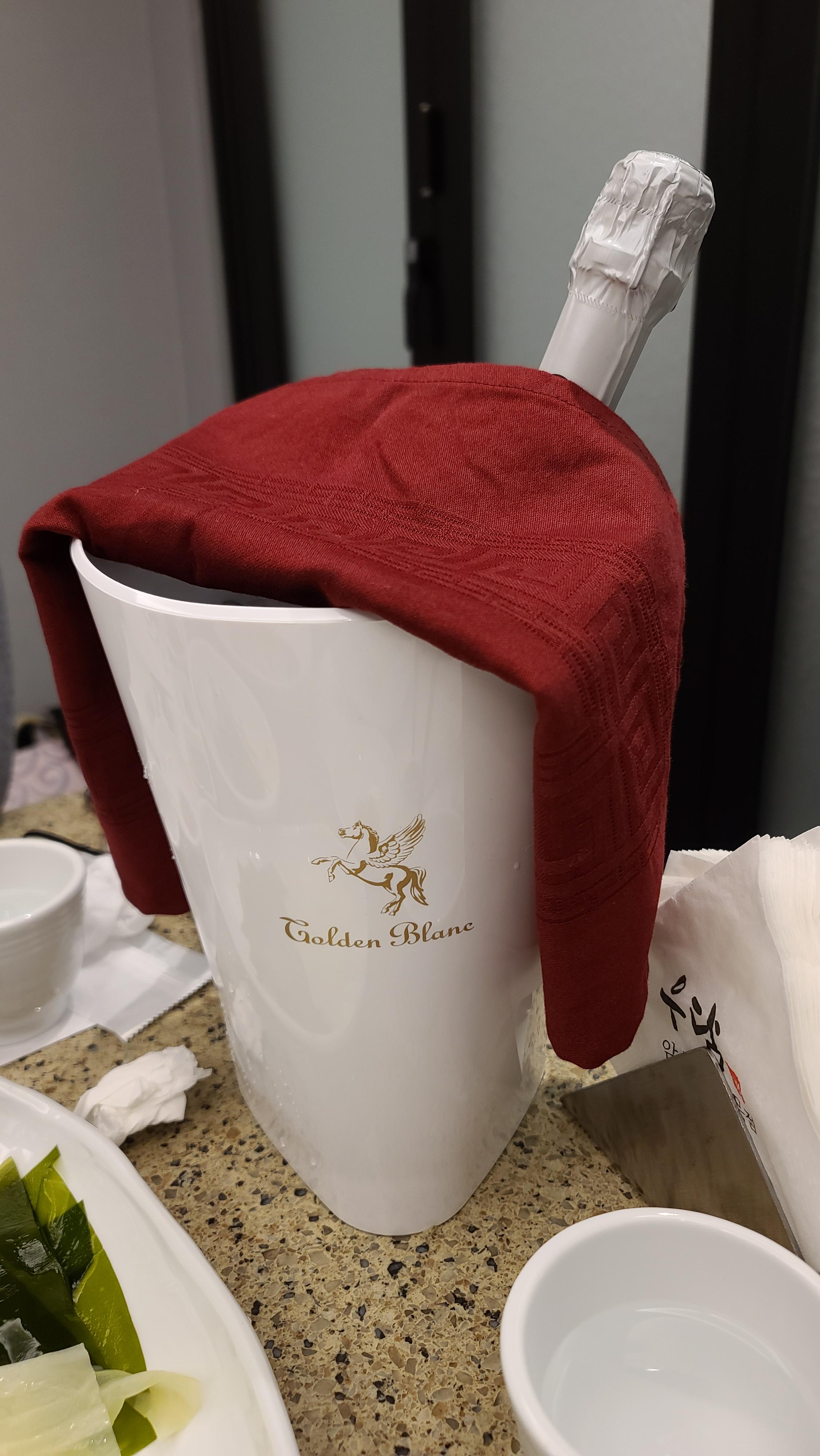 샴페인이 먼저나왔습니다. 샴페인은 칠링이 중요하기 때문에 최상의 맛을 위하여 먼저 얼음통에 칠링을 해놓기로 합니다. 샴페인은 기포가 많기 때문에 차갑게 마셔야 최고의 맛을 선사해주기 때문입니다.