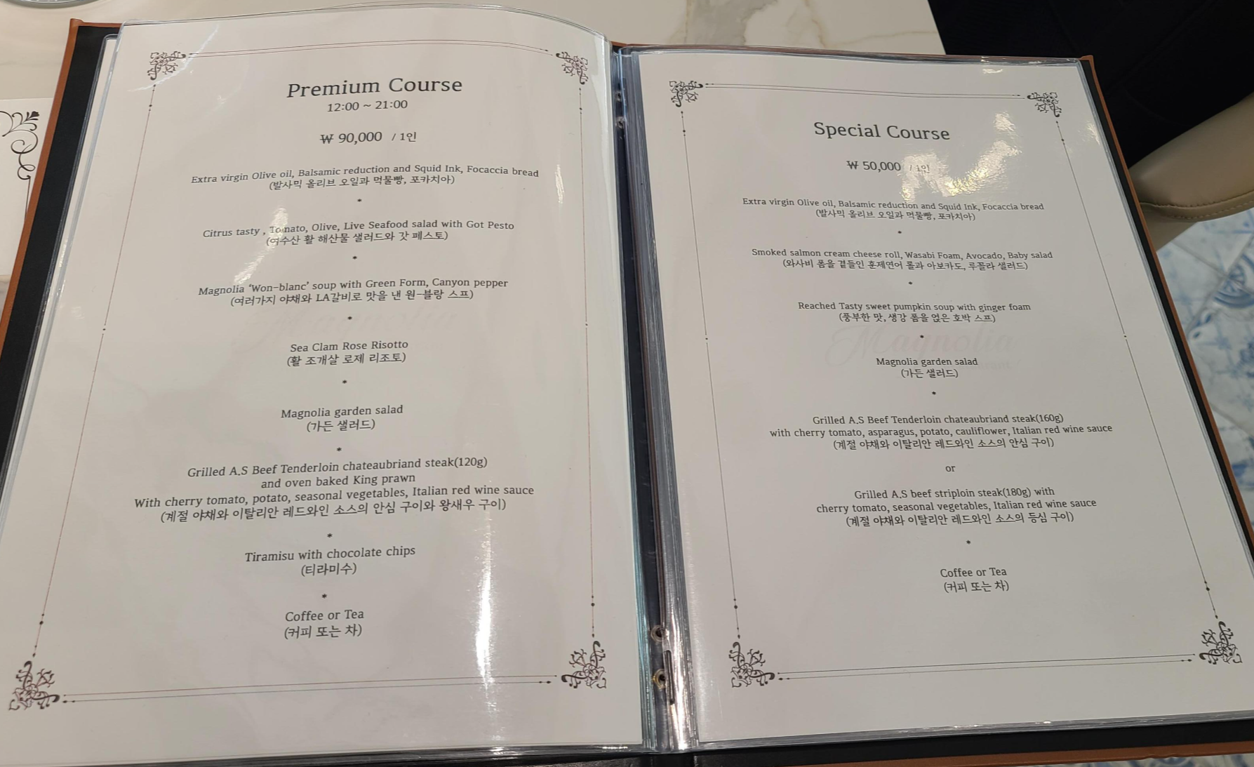 다른 메뉴들을 살펴보니 파스타, 스테이크, 샐러드 등 전형적인 이탈리안 레스토랑의 메뉴들이 보이고 코스구성도 보입니다. 이태리 레스토랑이니 코스로 먹어보기로 하고 스페셜 코스를 주문합니다.