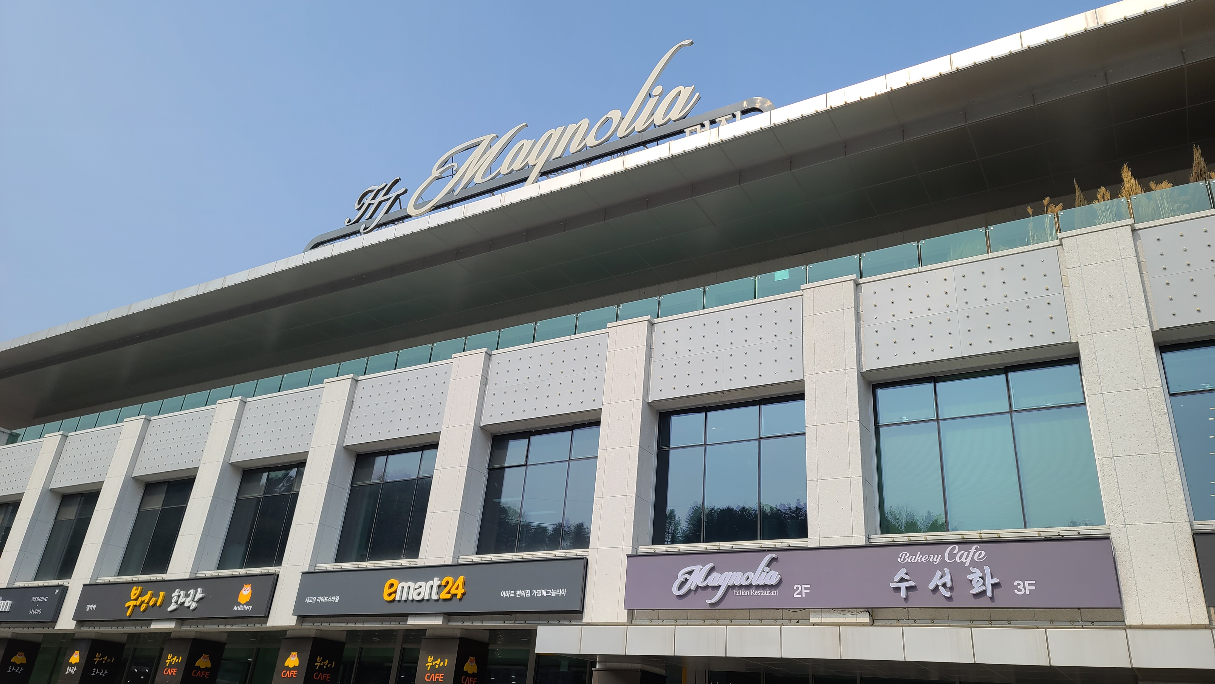 오랜만의 가평나들이 여행에서 청평호를 둘러보고 낭만적인 시간을 가지다 무엇을 먹을까 고민해봅니다. 돌아다니다 보니 도로가 주변에 세련되 보이는 건물이 보여 들어가보기로 합니다. 1층에는 편의점과 식당가가 보이고 건물 맨 위에는 매그놀리아 Magnolia 라고 쓰여있는것이 보입니다.