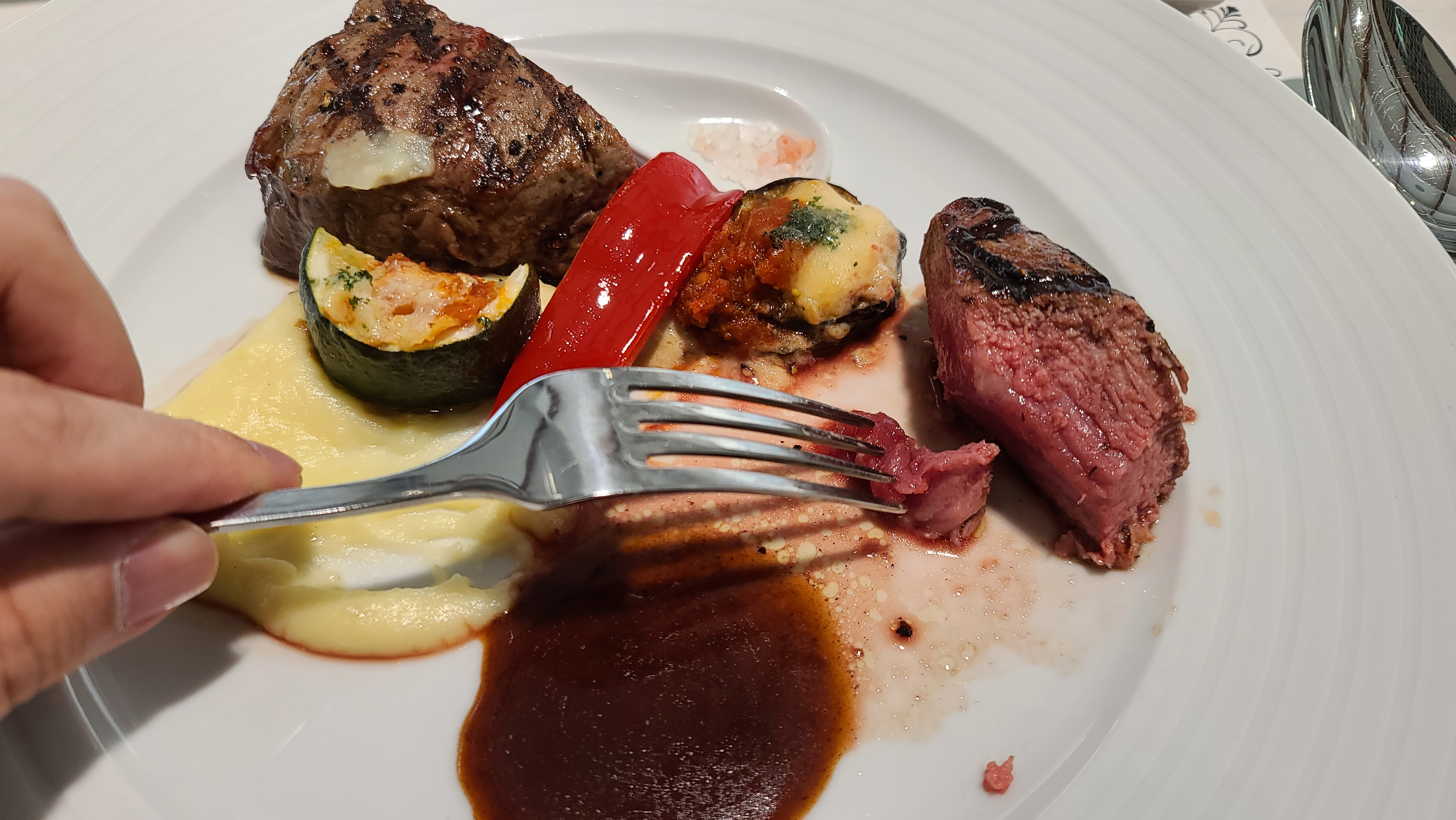 스테이크를 잘라서 속살을 맛보니 상당히 부드러운 느낌이 전해집니다. 180g 의 무게로 상당히 고기량이 많게 느껴지는데다 야채까지 곁들이니 포만감이 불러옵니다. 즐겁게 대화를 하며 코스요리를 즐겨봅니다.