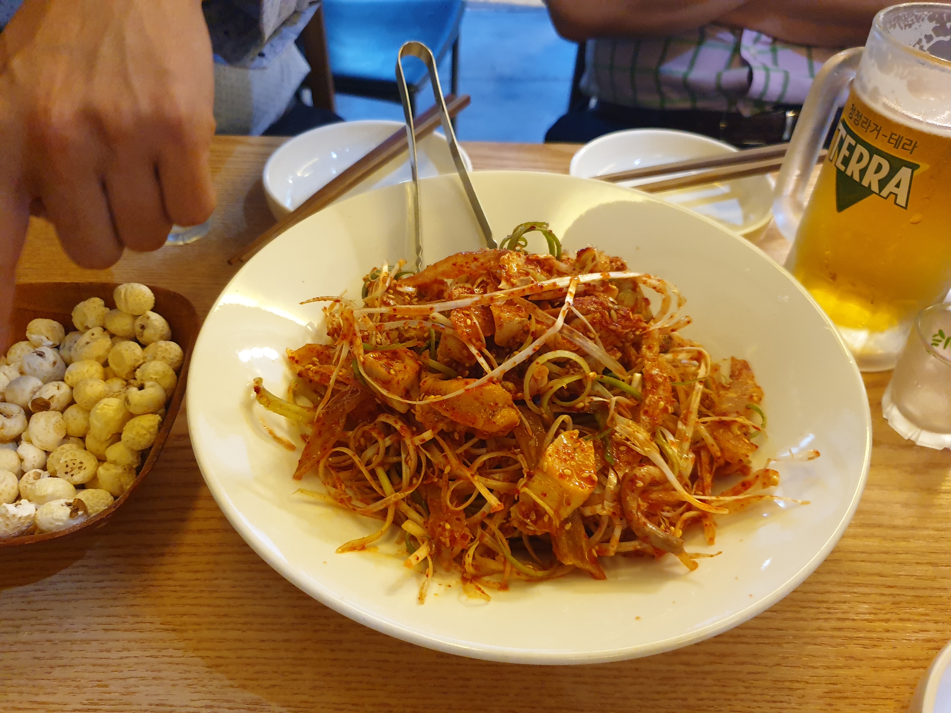 을지로골뱅이가 나왔습니다. 파를 슬라이스하고 그 위에 고추가루 및 양념으로 버무린 전형적인 골뱅이무침의 비주얼입니다.