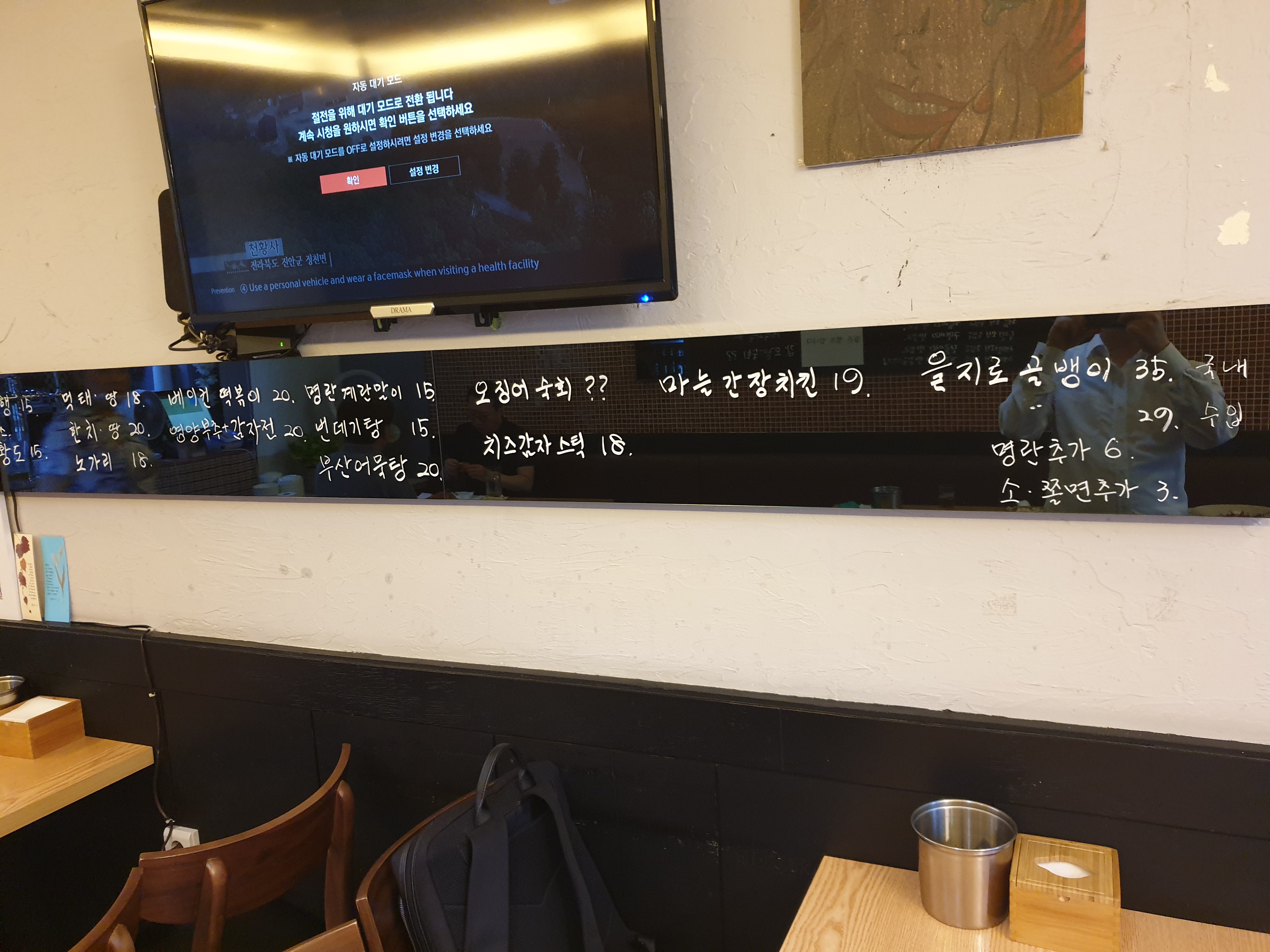 메뉴판이 벽면 블랙보드에 씌여 있습니다. 메뉴판에 오징어 숙회의 가격이 ?? 로 설정되어있는것이 인상적입니다. 을지로골뱅이의 메뉴가 국내산과 수입산으로 나뉘어져 있는것도 흥미롭습니다. 밖에 현수막에서 국산골뱅이에 끌려서 들어왔으니 사장님께 을지로골뱅이 국내산에 계란말이를 추가하고 소면은 이색적으로 쫄면으로 먹어보기로 주문합니다.