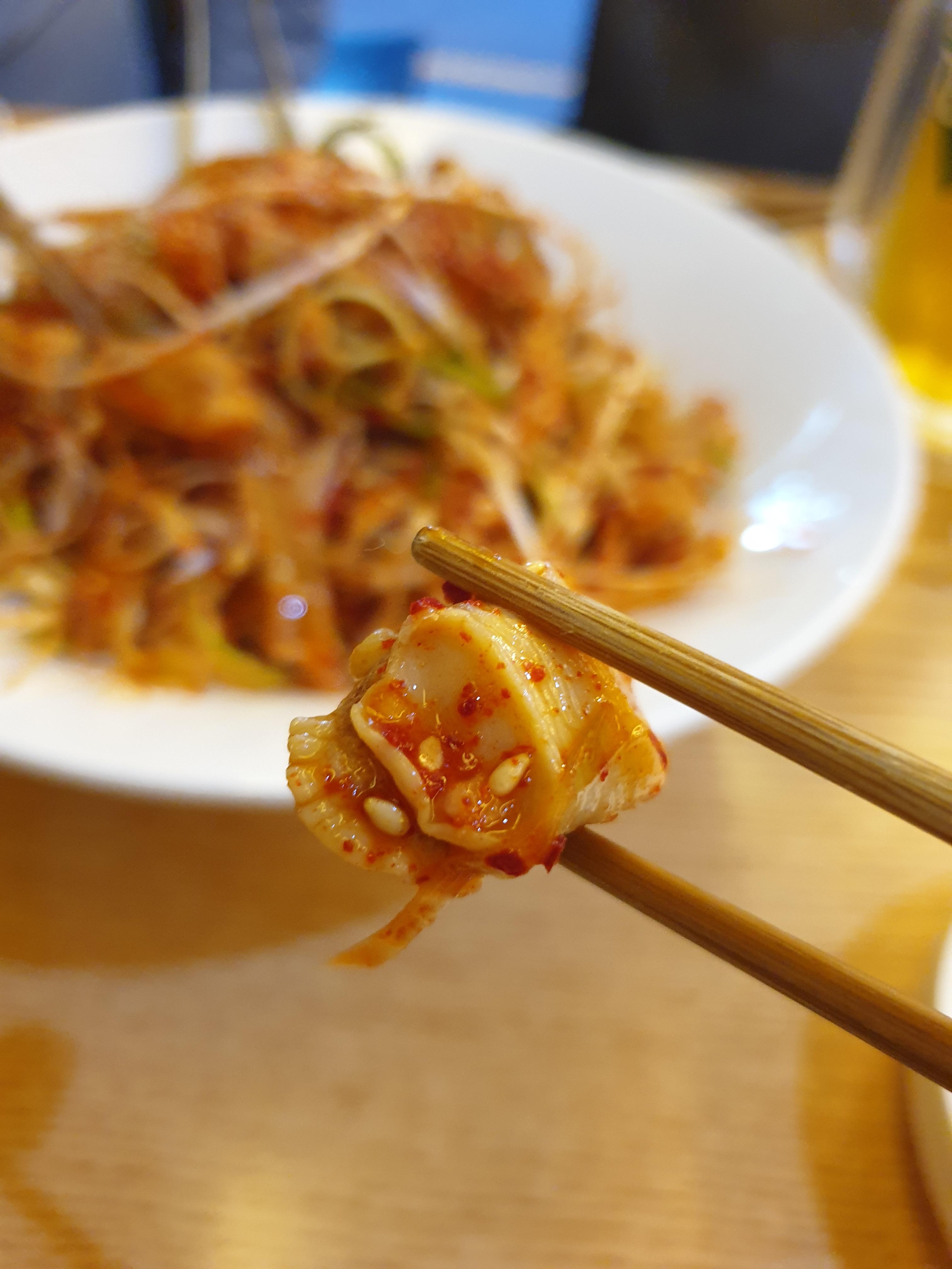 골뱅이를 집어서 보니 통통한 것이 보기 좋습니다. 입에 넣어보니 촉촉하게 씹히는 맛이 좋습니다. 전체적으로 양념은 매운맛이 강하니 조심하셔야합니다.