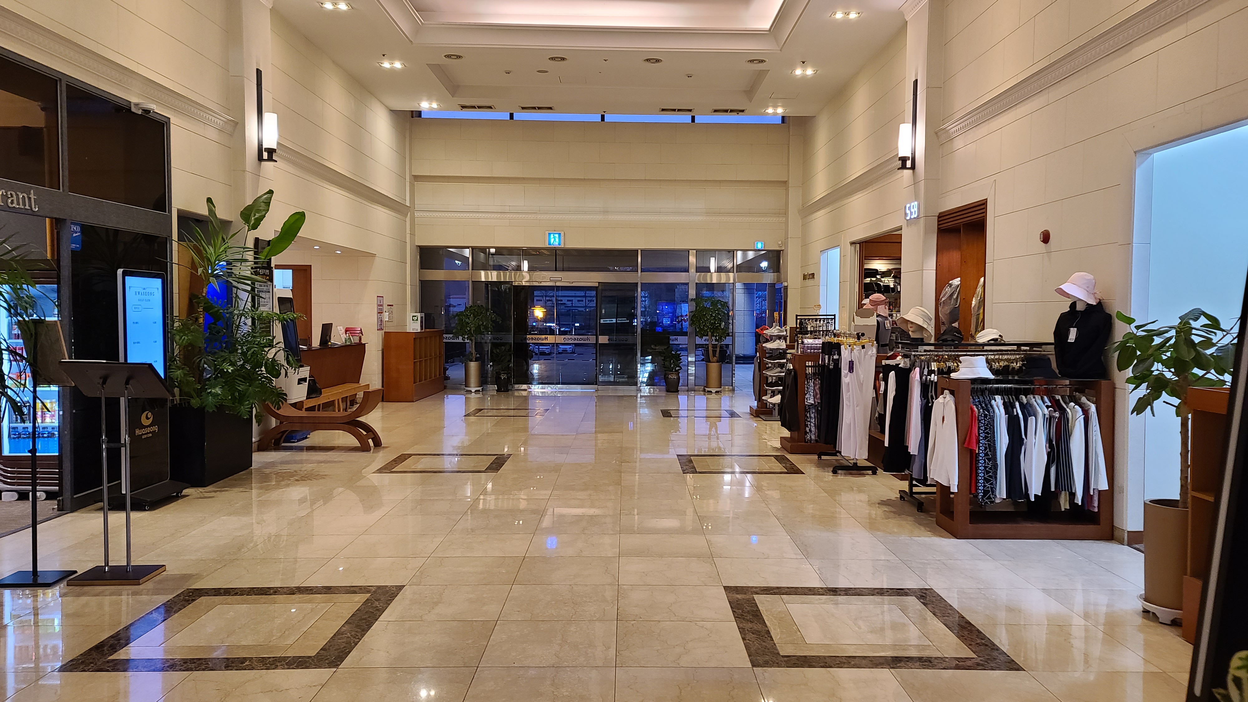 클럽하우스 내부를 담아봅니다. 정면에 출입문을 기준으로 좌측에 카운터와 식당이 위치하고 있으며 우측에 샵과 락커룸이 있습니다. 조그맣지만 세련되게 꾸며놓은 모습이 보입니다.
