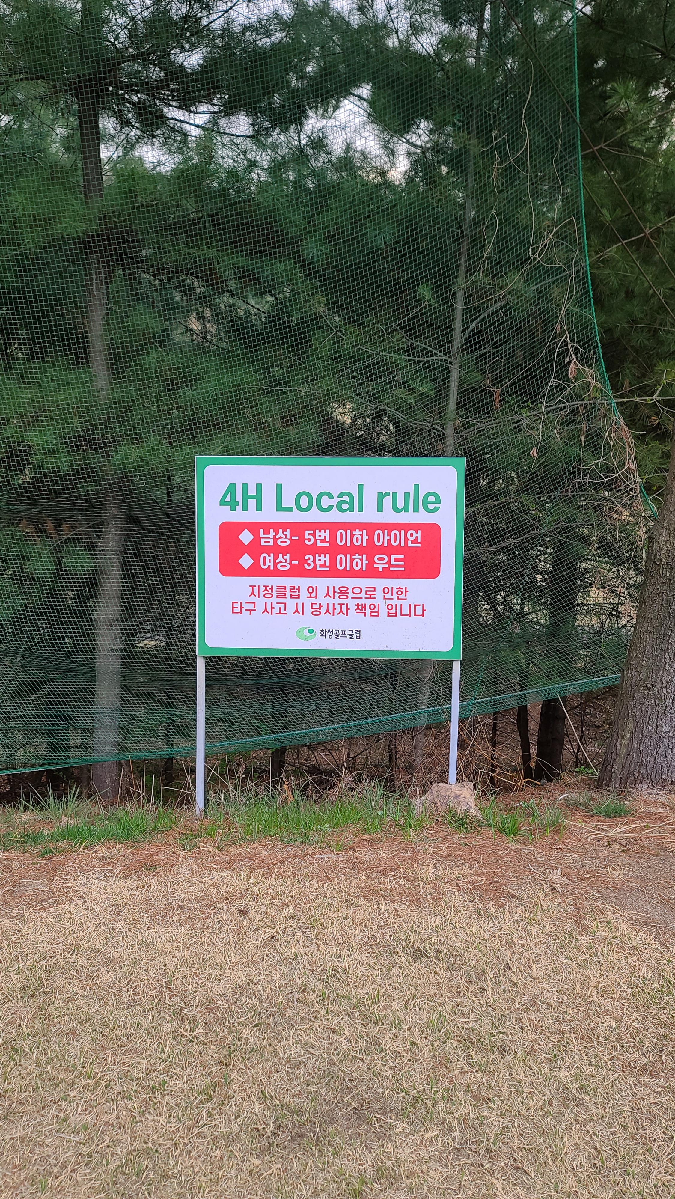 화성CC의 핸디캡 1번홀이라고 할 수 있는 6번 파4홀입니다. 좌측으로 심하게 휘어진 도그렉홀로 직선거리상으로는 원온이 가능한 거리이나 티박스 옆에 그린방향으로 티샷금지라고 적혀있습니다. 강제적으로 끊어가게 만든 코스입니다.