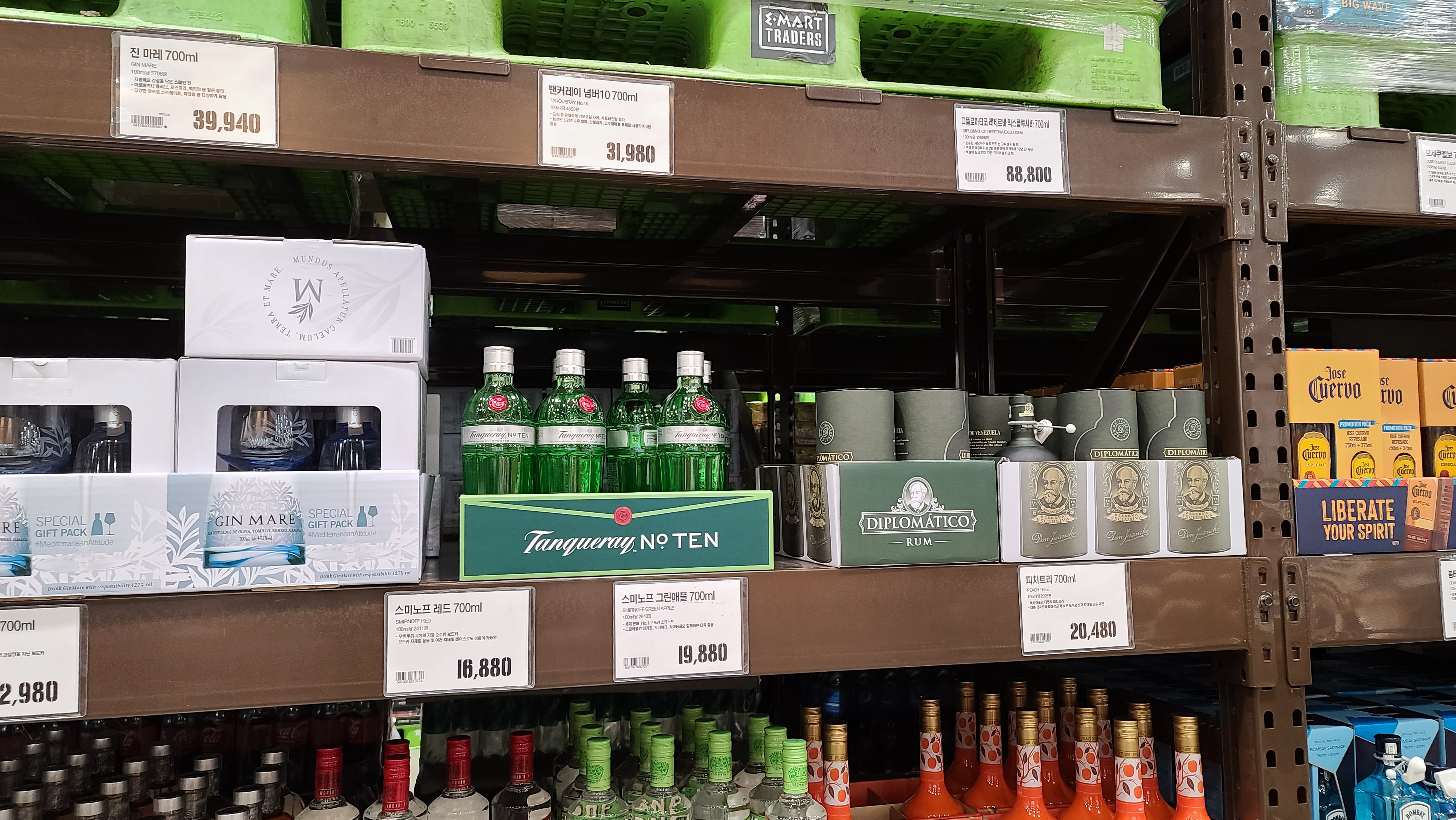 위쪽을 살펴보면 진마레, 탱커레이라고도 불리우는 탠커레이 넘버10, 디플로마티코 레제르바 익스클루시바 제품이 보이고 있습니다. 정말 다양한 주류를 트레이더스에서는 볼 수 있는것 같습니다.