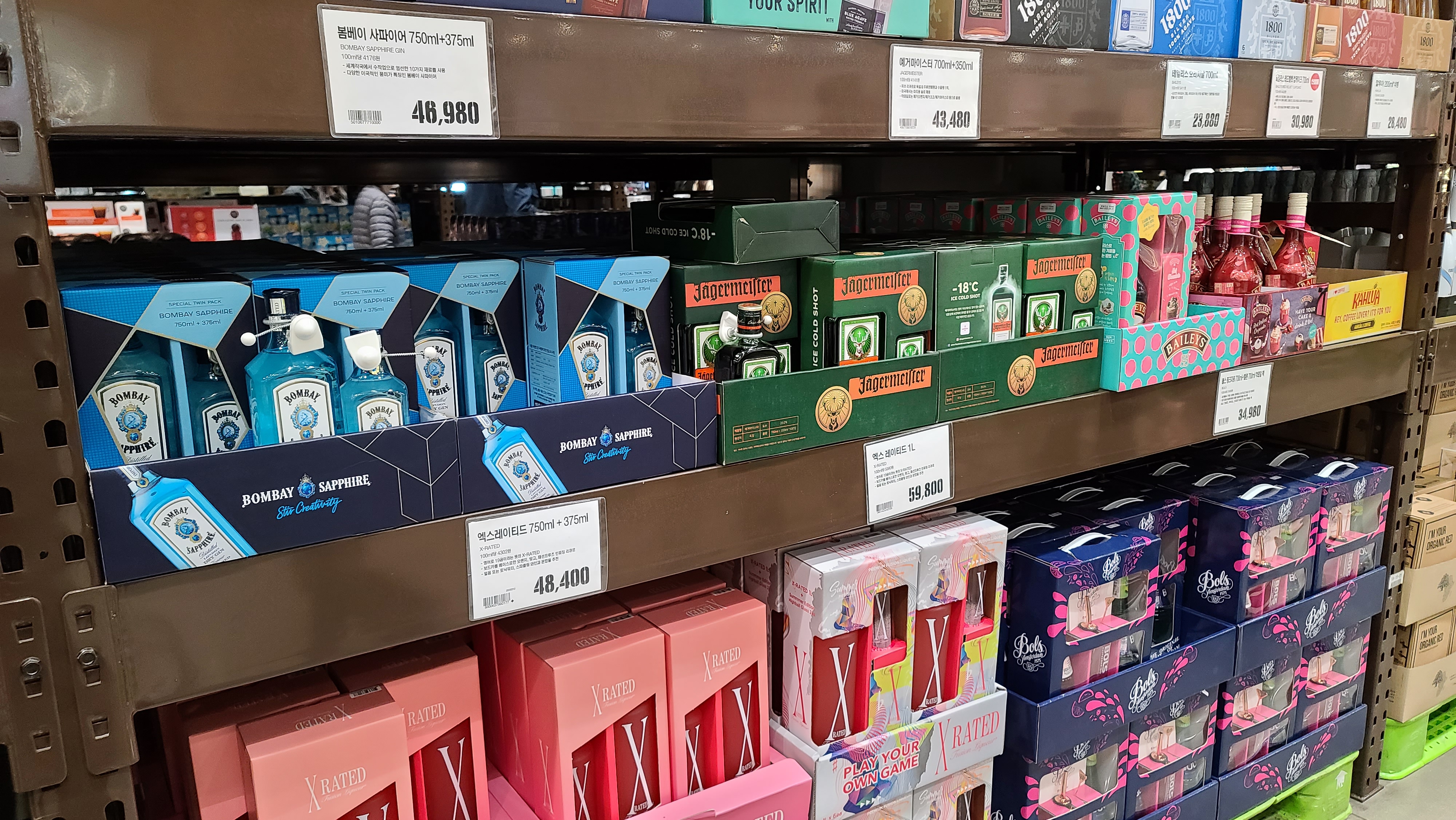 데킬라 아래쪽으로는 봄베이 사파이어, 예거사파이어, 볼스 등 진 제품이 진열되어 있으며 깔루아와 엑스레이티드 등 리큐르 제품도 보이고 있습니다.