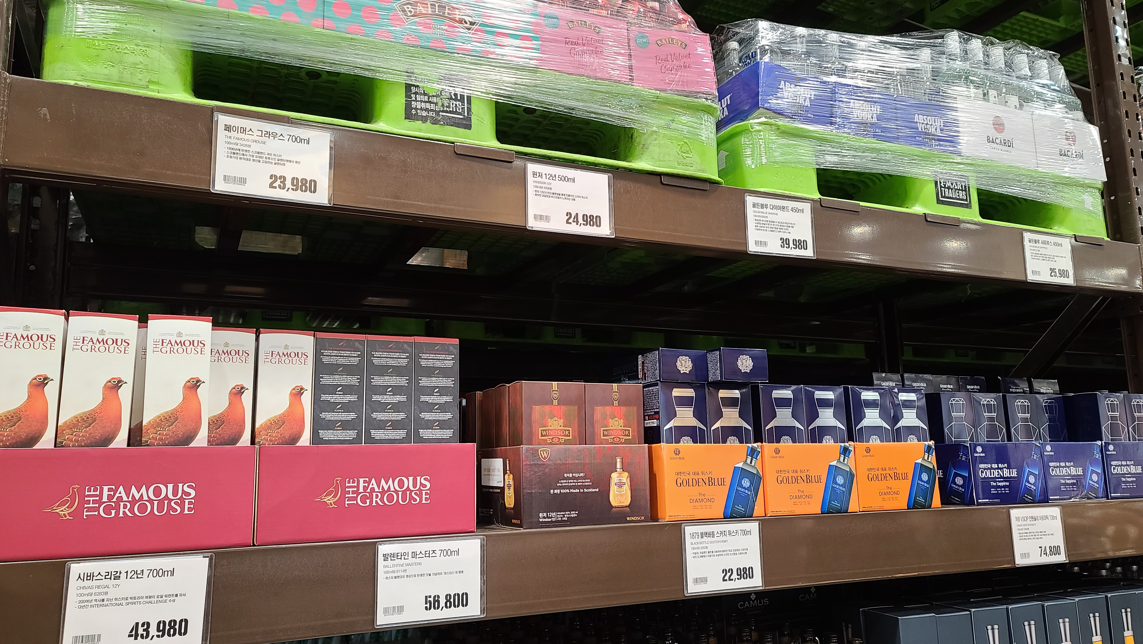 페이머스 그라우스, 윈저 12년, 골든블루 제품은 위쪽으로 자리잡고 있어서 눈높이에 따른 상품 배치가 인상적으로 다가옵니다.