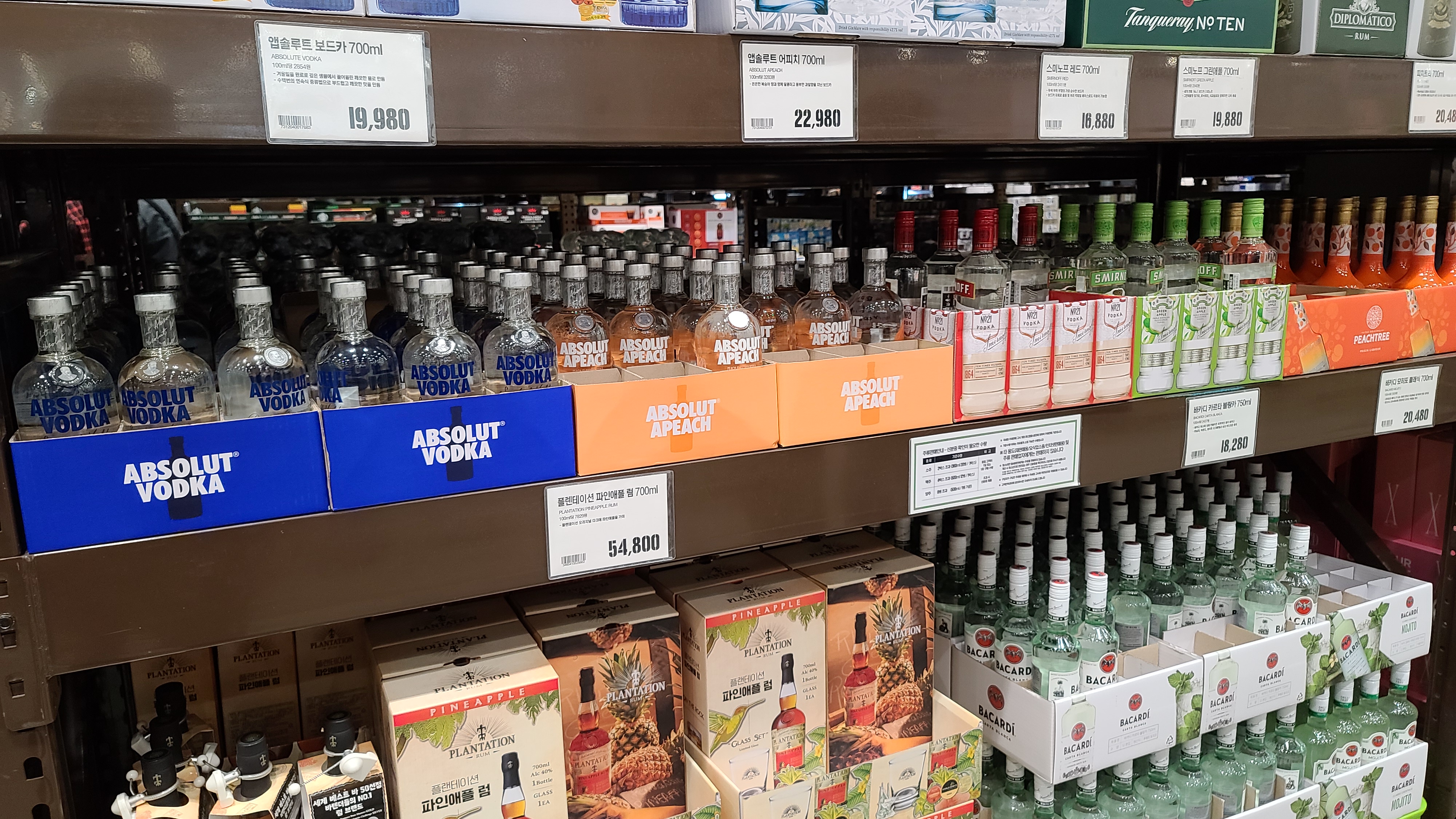 옆으로 살펴보니 다시 진, 럼, 보드카가 진열되어 있습니다. 앱솔루트 보드카 오리지널 가장 인기가 좋은 앱솔루트 어피치, 스미노프 레드 및 그린애플, 플렌테이션 파인애플 럼, 바카디 카르타 블랑카, 바카디 모히또 클래식, 피치트리가 진열되어있는 모습입니다.