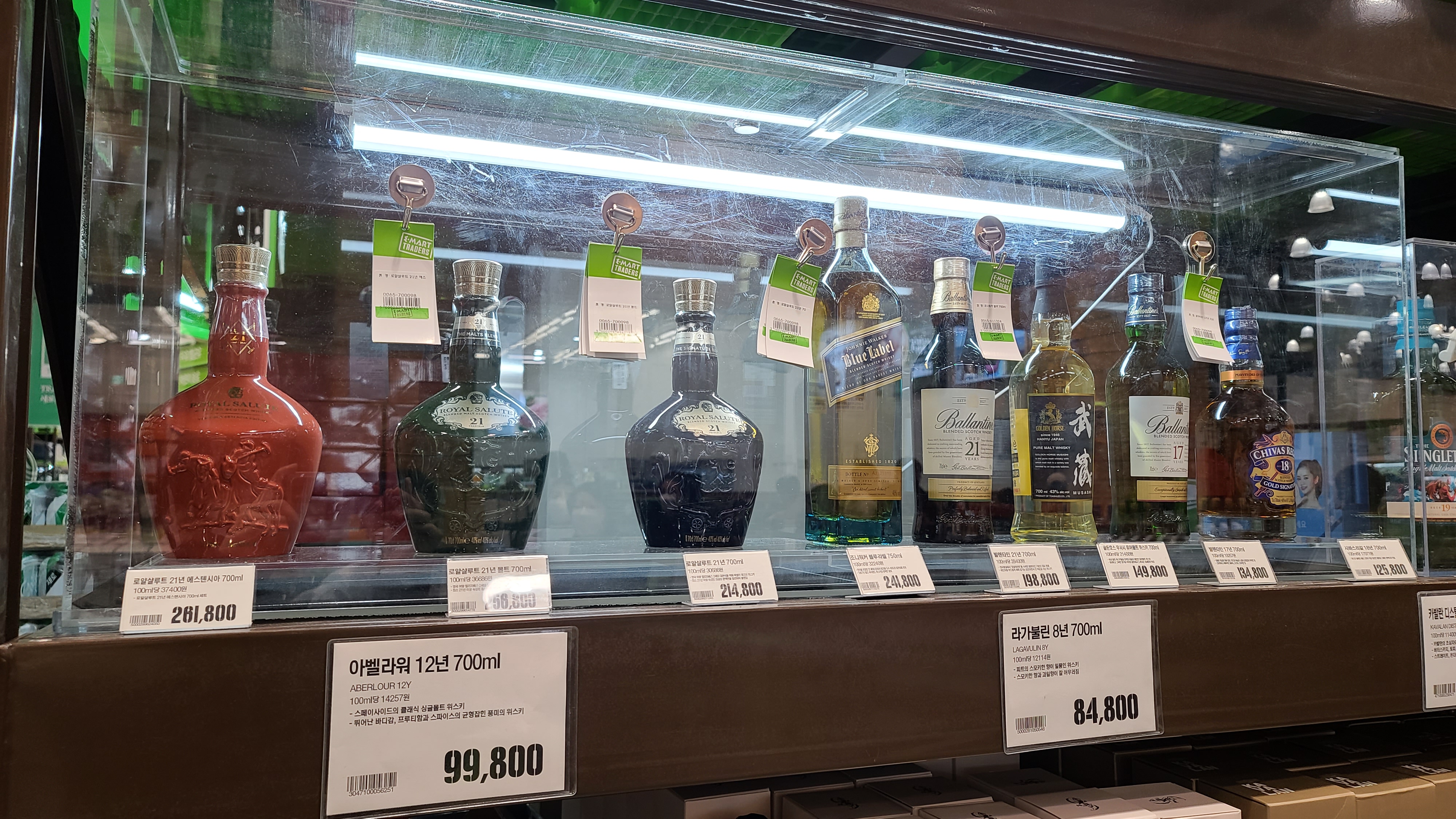입구쪽 시선이 닿는곳에 위치한 고급위스키 진열장을 살펴봅니다. 로얄살루트, 조니워커 블루라벨, 발렌타인 21년, 시바스리갈, 골든호스 무사시 등 가격이 비교적 비싼 위스키들이 진열되어 있습니다. 위스키가 잘나가는 요즘 몸값이 높으신 제품들입니다.