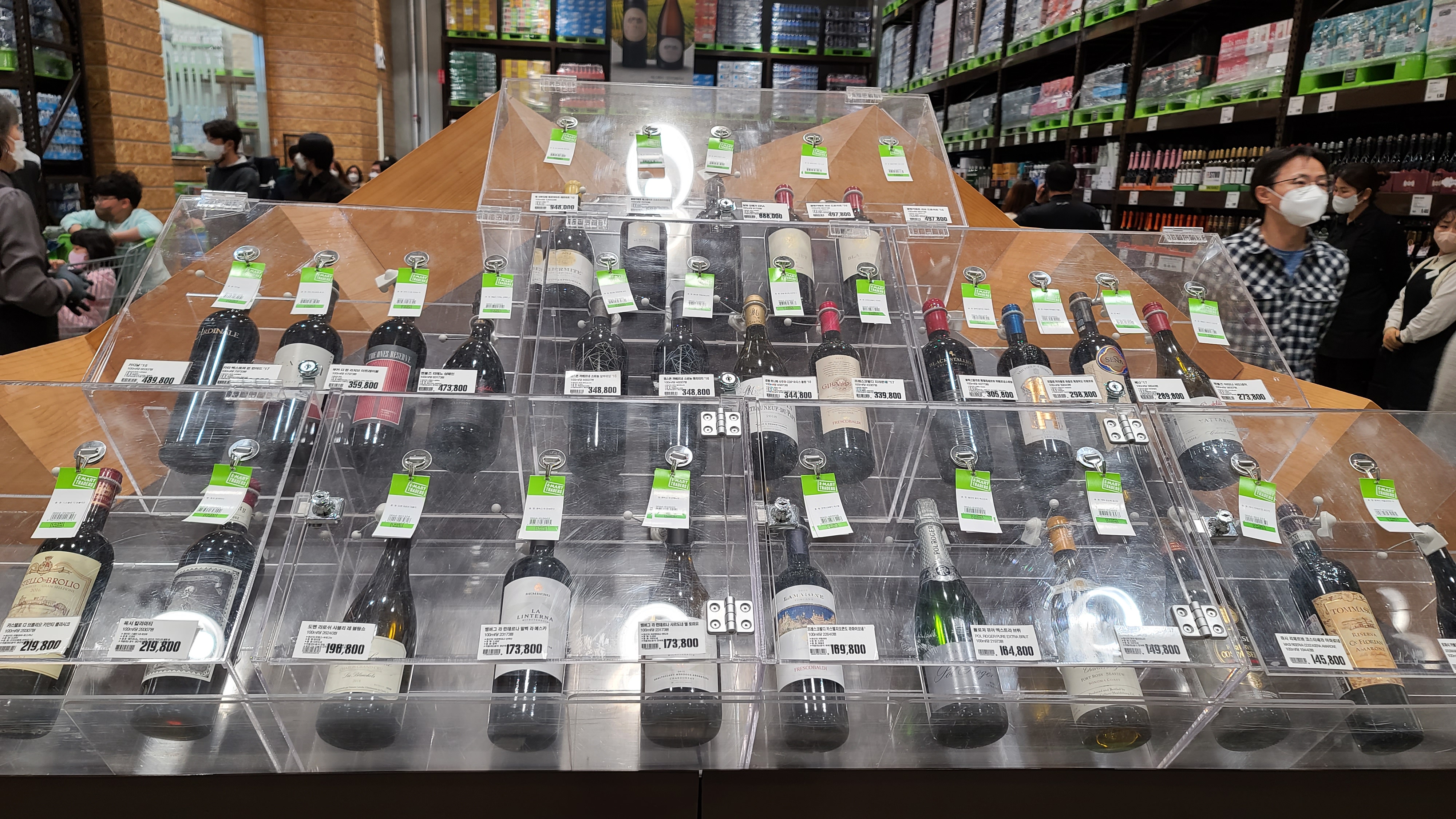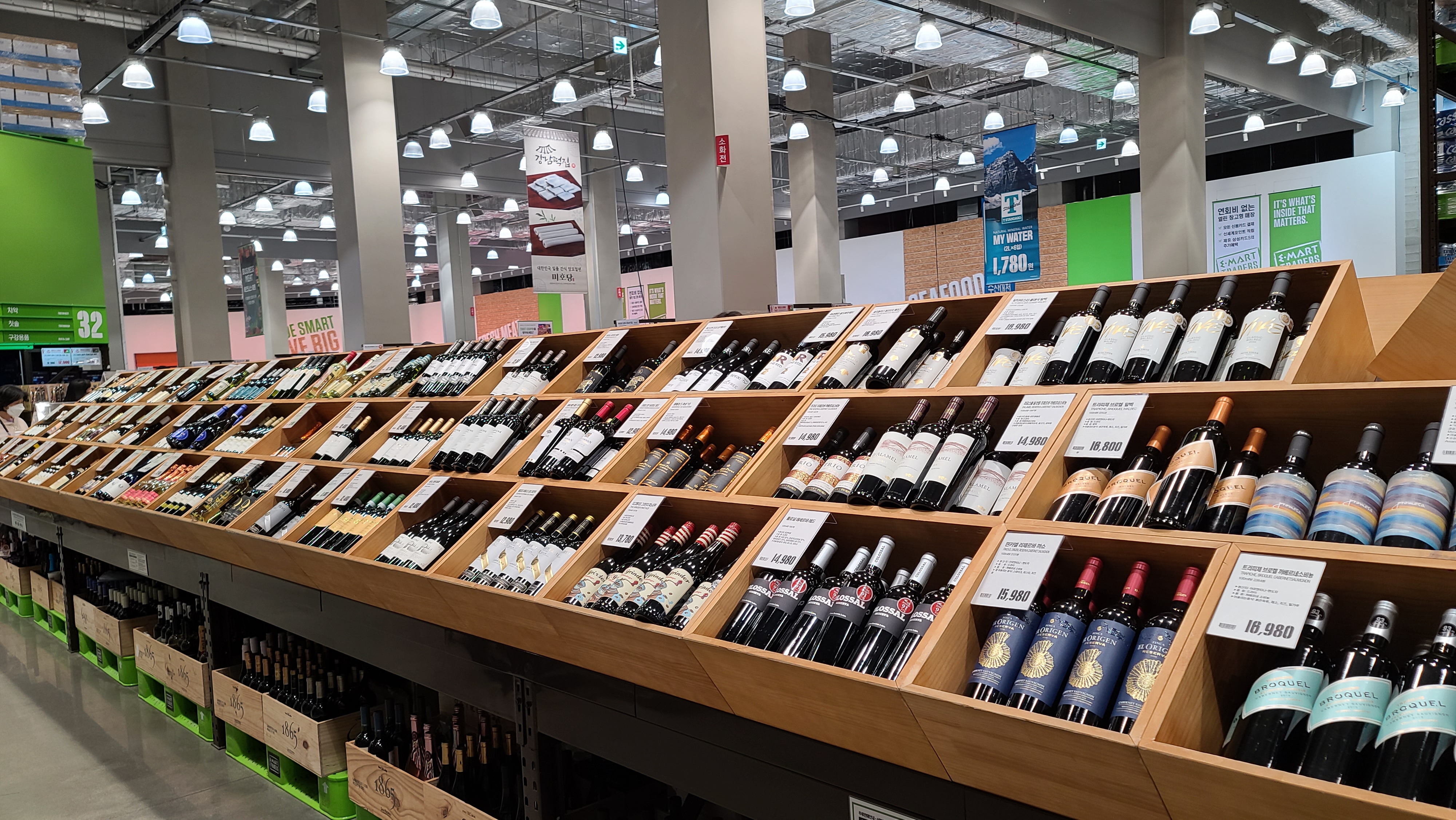 철제 진열대를 지나서 어떤 제품이 있는지 더 살펴보니 나무 진열대에 와인들이 가득히 진열되어 있습니다. 여러 국가의 셀수도 없는 다양한 와인들이 소비자를 기다리며 진열되어 있는 모습이 무척 인상적입니다. 1만원대부터 수십만원까지 다양한 와인종류를 보니 정말 세상은 넓고 술도 끝이 없다는 것을 느끼게 되며 이마트 트레이더스 주류쇼핑을 마무리합니다.