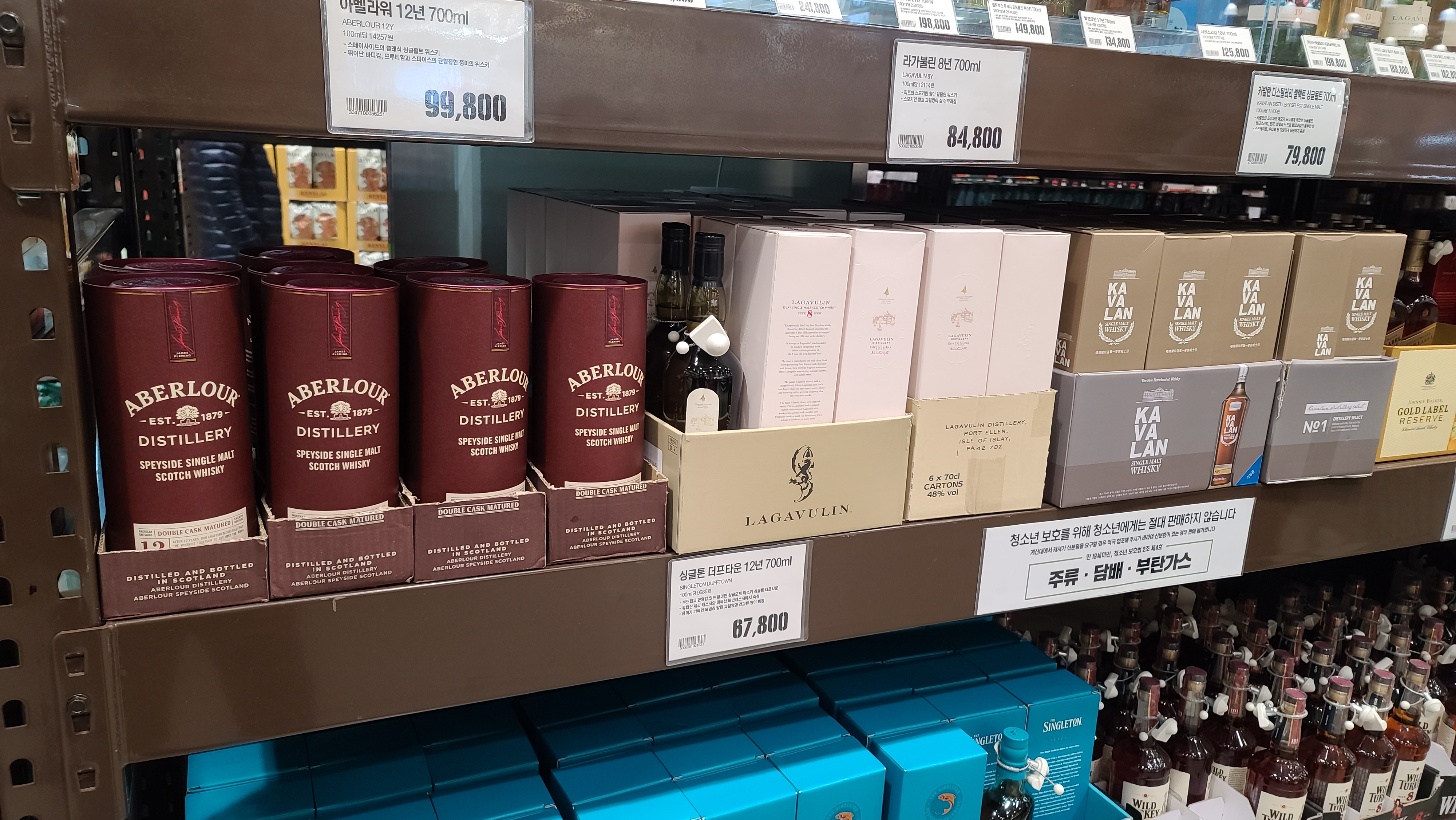 아래로는 아벨라워 12년과 라가불린 8년, 카발란 디스틸러리 셀렉트 제품이 보이고 밑으로는 싱글톤 더프타운 12년 제품이 진열되어 있습니다.