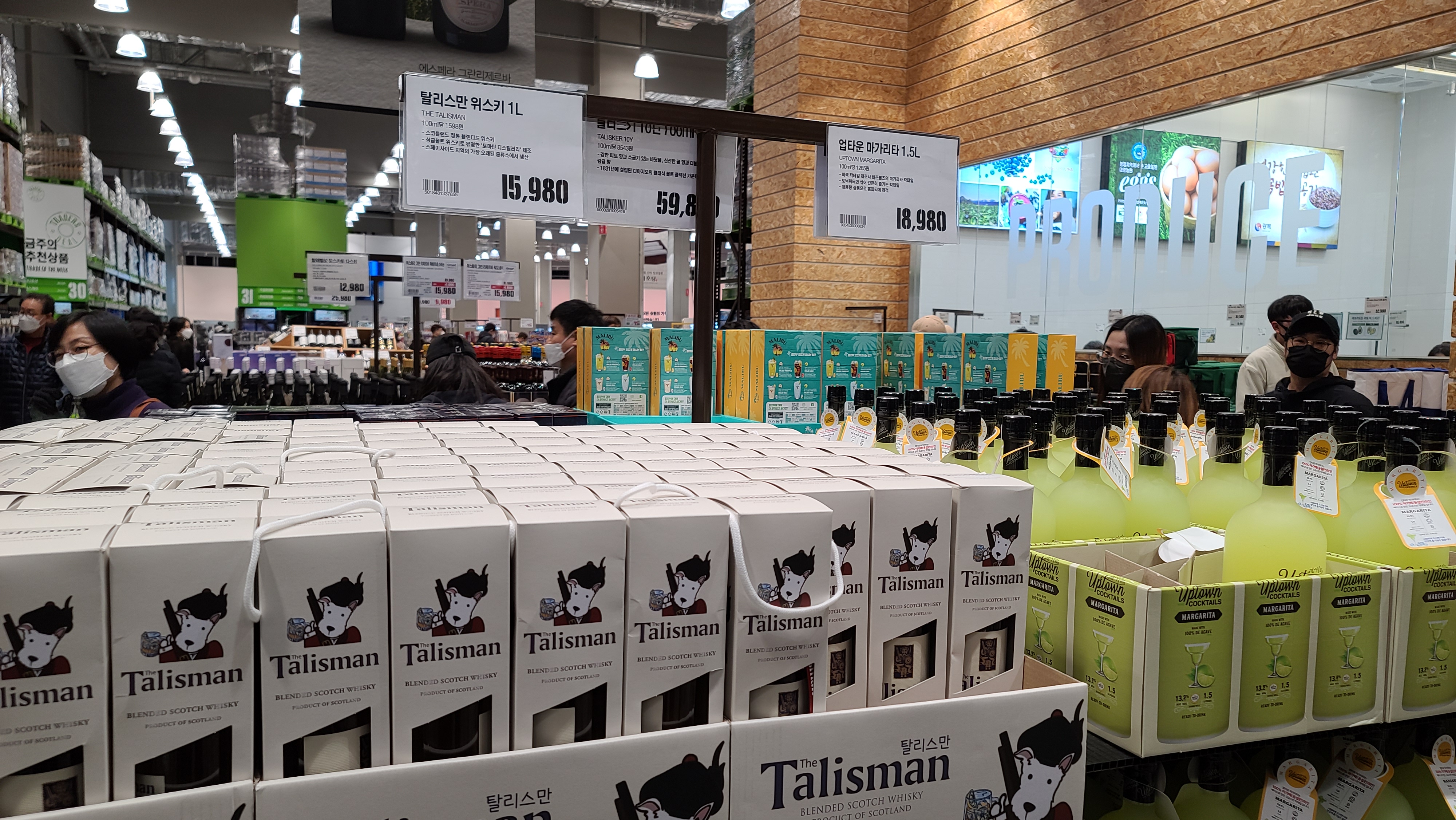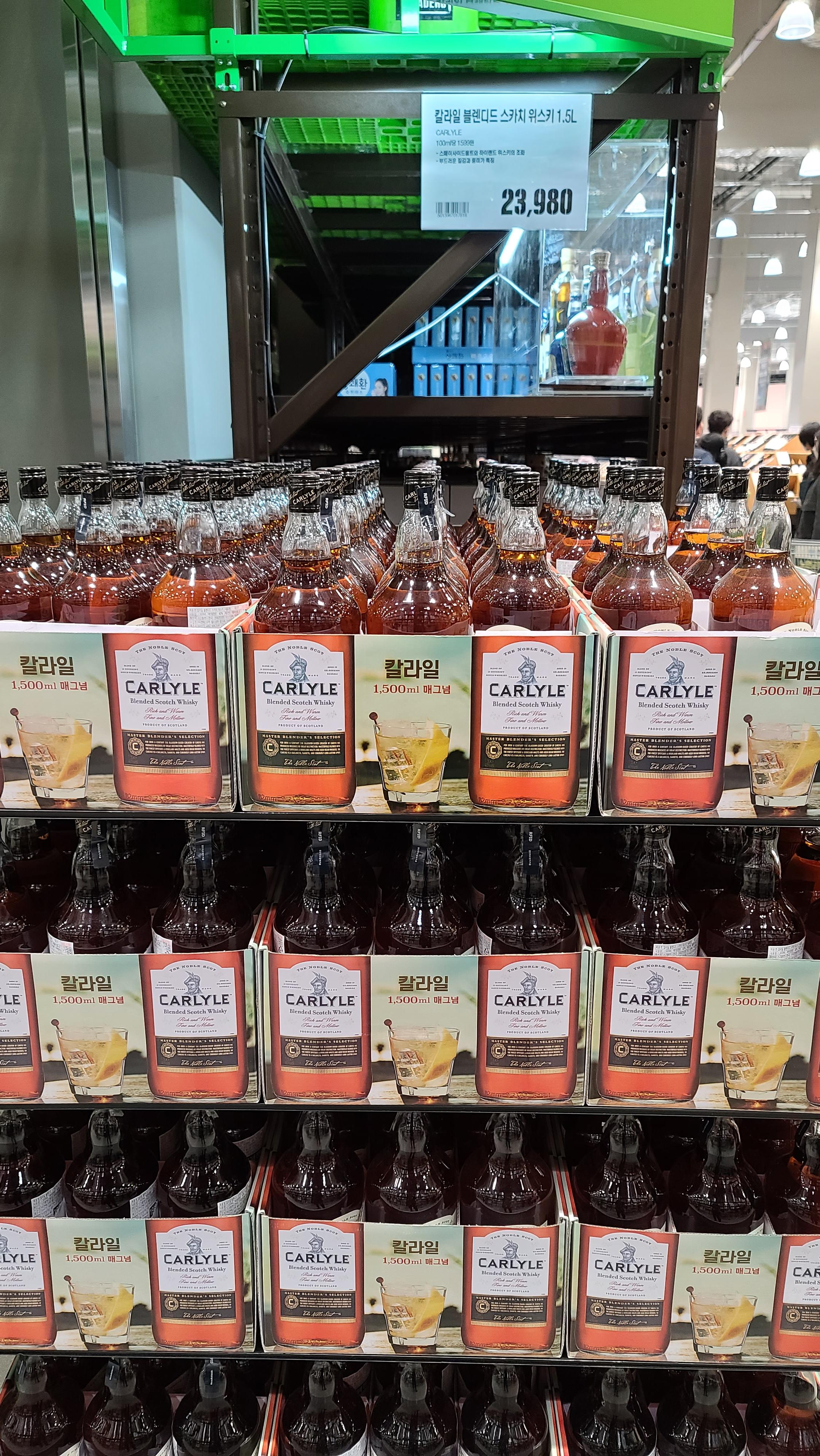 진열대 한쪽을 가득 채운 칼라일 블렌디드 스카치 위스키와 탈리스만 위스키 그리고 업타운 마가리타 제품이 눈에 들어옵니다. 역시 가성비가 높아서 그런지 매대를 넓게 차지하고 있는 모습입니다.