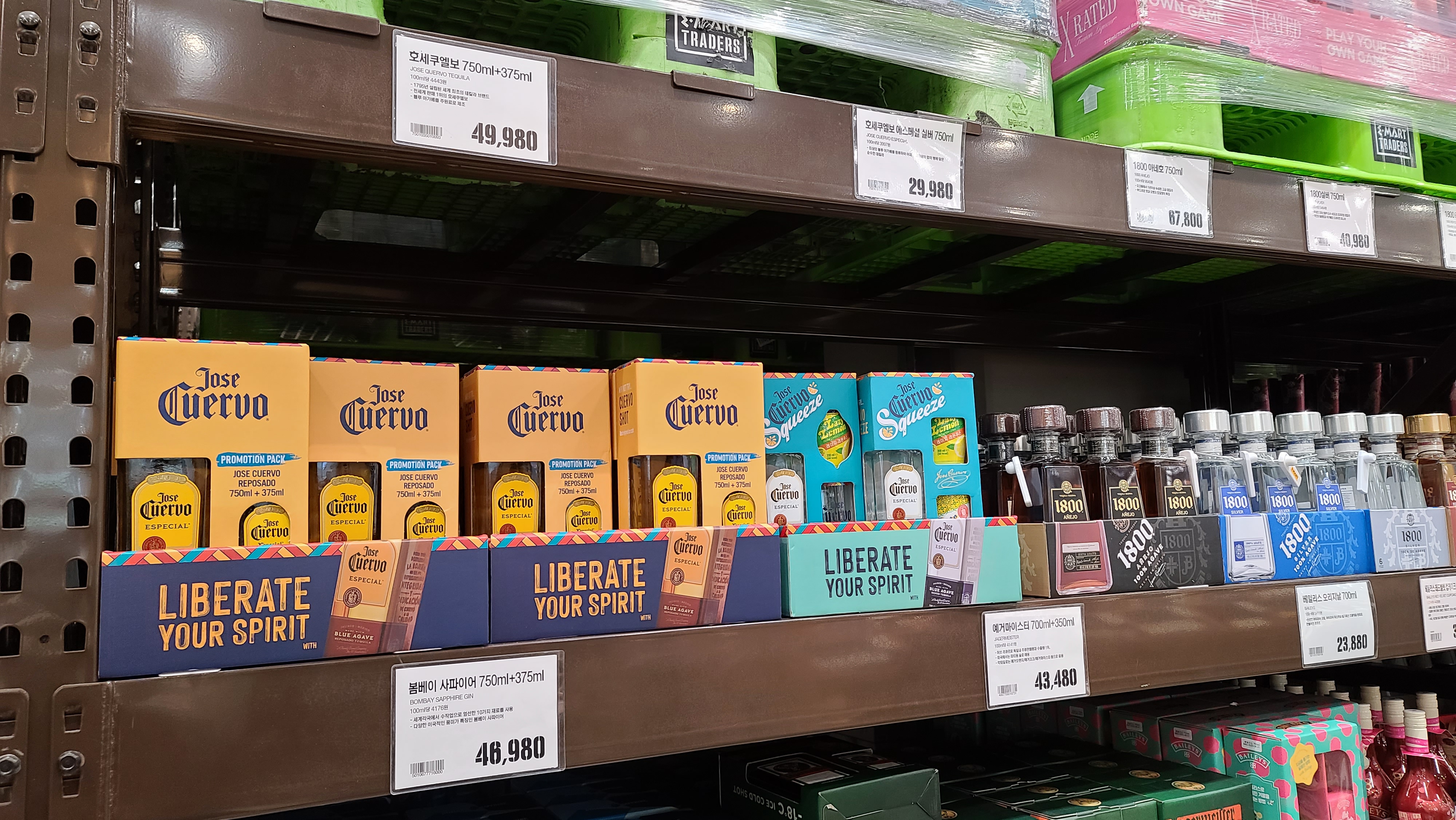 옆쪽을 살펴보니 위스키의 진열이 끝난듯이 호세쿠엘보와 1800 아네호, 실버 그리고 레포사도의 데킬라 제품이 보이고 밑으로는 베일리스 등 리큐르 제품이 눈에 들어옵니다. 위스키 말고 다른주류를 보게되니 감회가 새롭습니다.