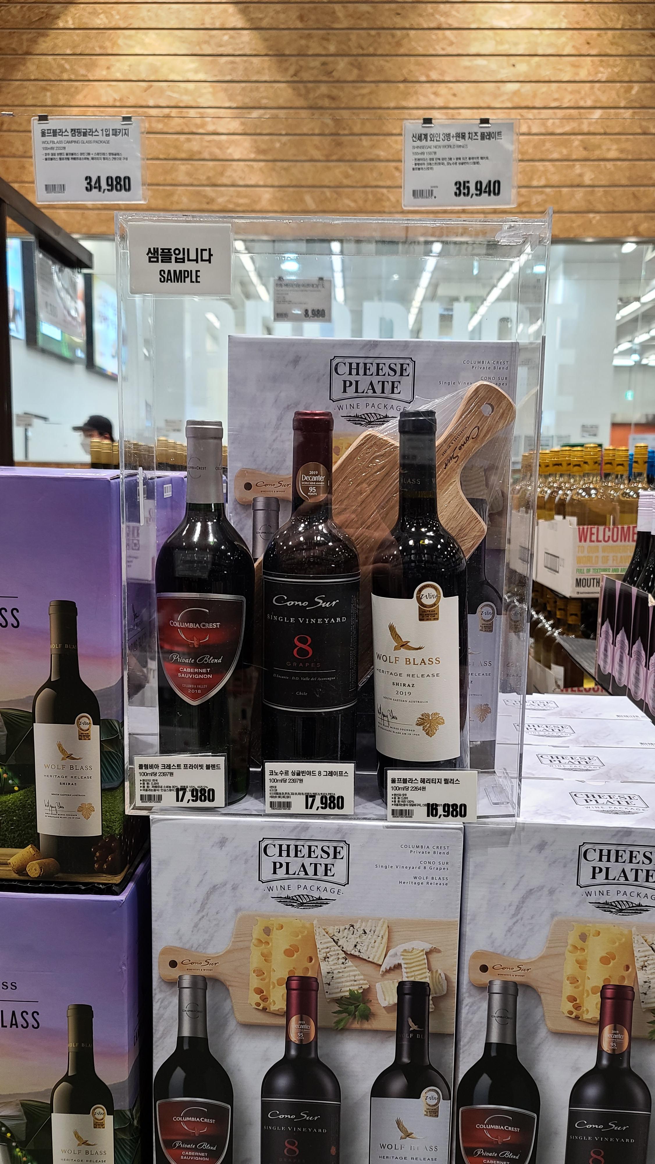 주류코너쪽은 안쪽 깊숙이 자리잡고 있으며 통로 한쪽을 가득 메우고 있습니다. 주류 코너 입구를 보니 울프블라스, 코노수르 싱글빈야드, 콜롬비아 크레스트 프라이빗 등 이마트 트레이더스 특선 와인이 단독 진열대를 차지하고 있는 모습이 보입니다. 와인을 사면 원목으로 만들어진 치즈플레이트를 껴준다니 혹하게 만드는 구성입니다.
