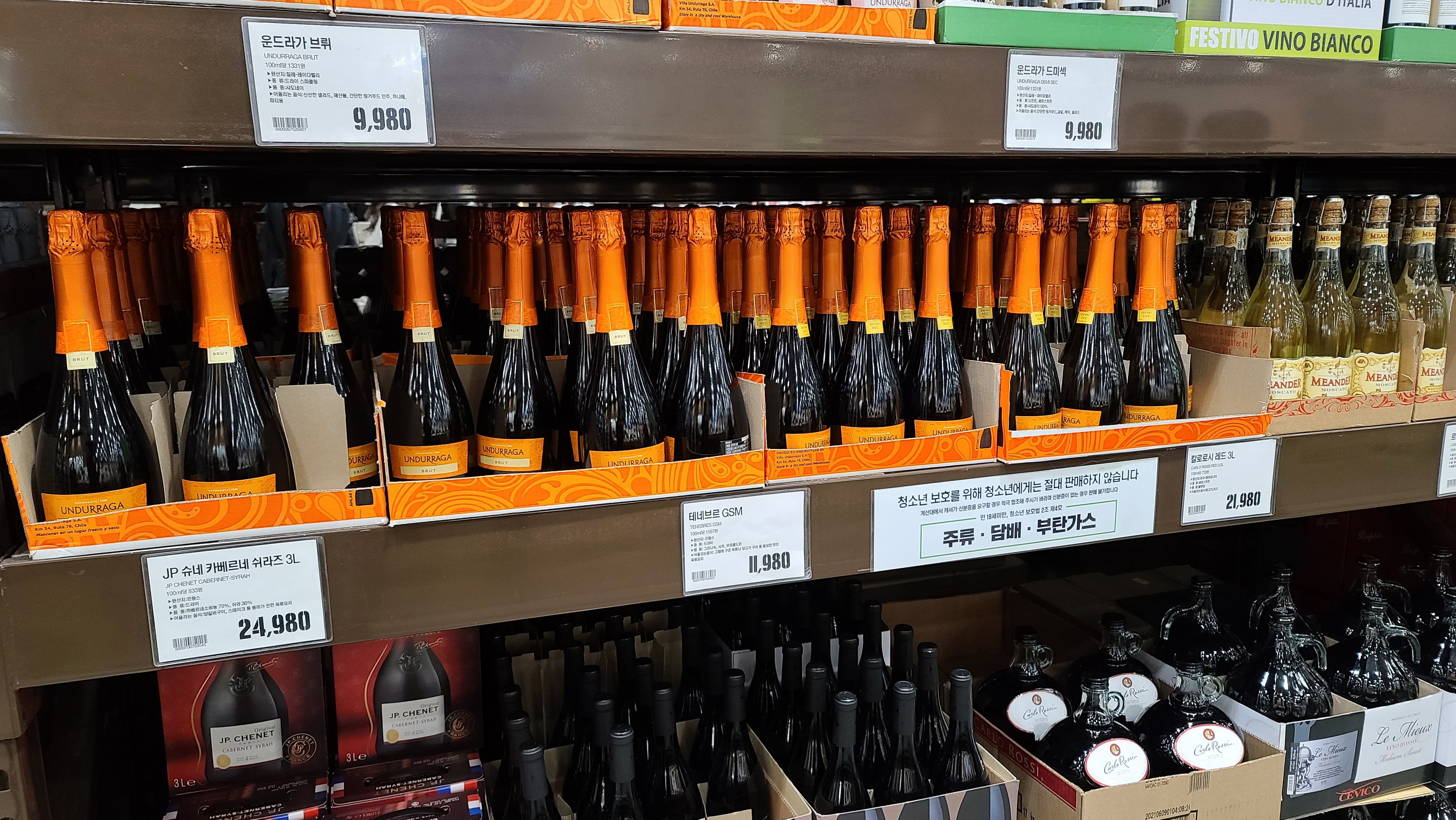 아래쪽으로는 JP 슈네 카베르네 쉬라즈 대용량 3L와 테네브르 GSM 그리고 국내에서 많이 팔리기로 유명한 칼로로시 와인 대용량 제품이 진열되어 있습니다.