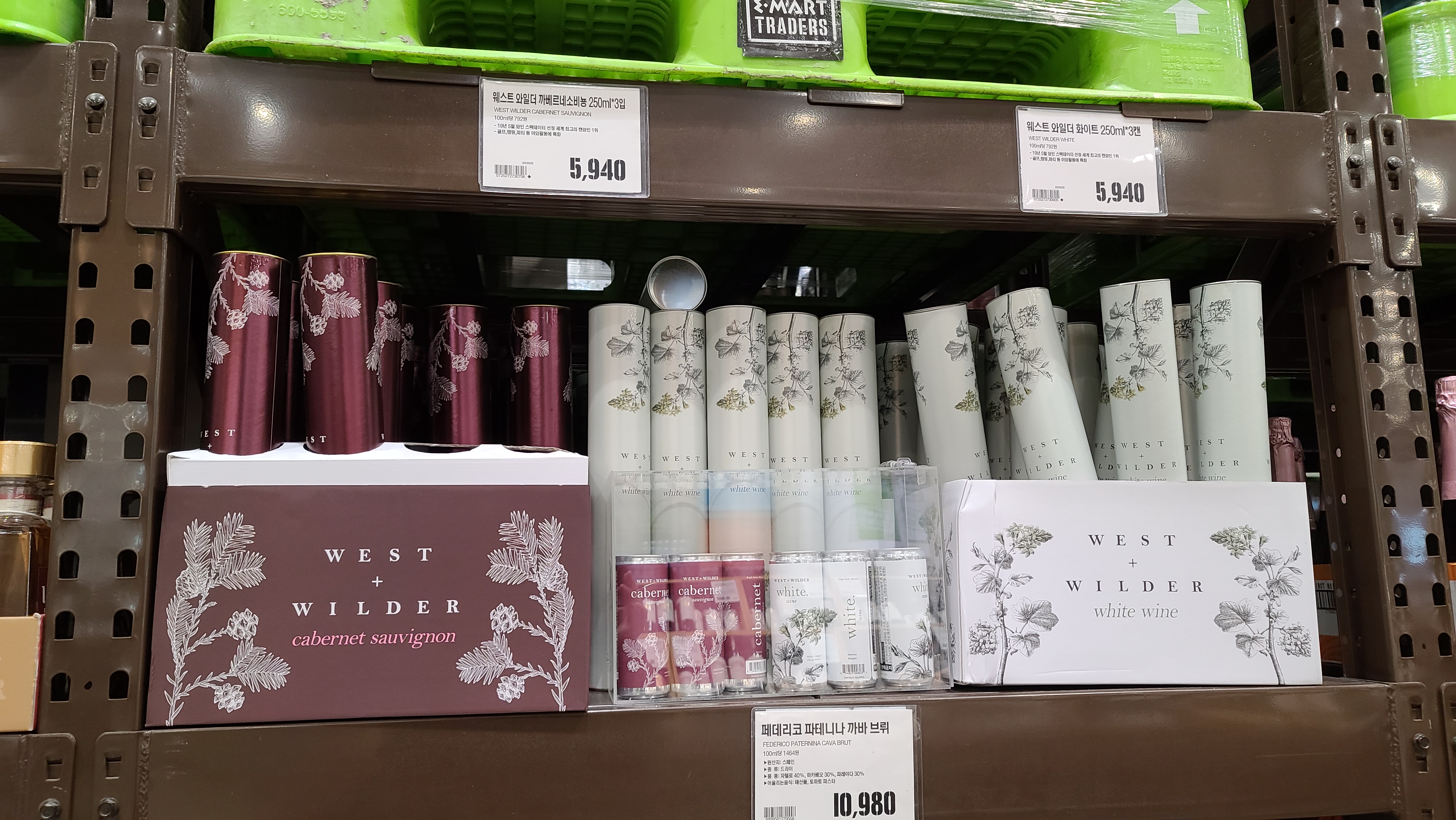 위스키와 진, 럼, 보드카, 리큐르등 다양한 주류의 진열이 끝나자 이제 요즘 마트에서 가장 핫하다는 주류 와인이 진열되기 시작합니다. 웨스터 와일더 상품과 페데리코 파테니나 까바 제품이 눈에 들어옵니다.