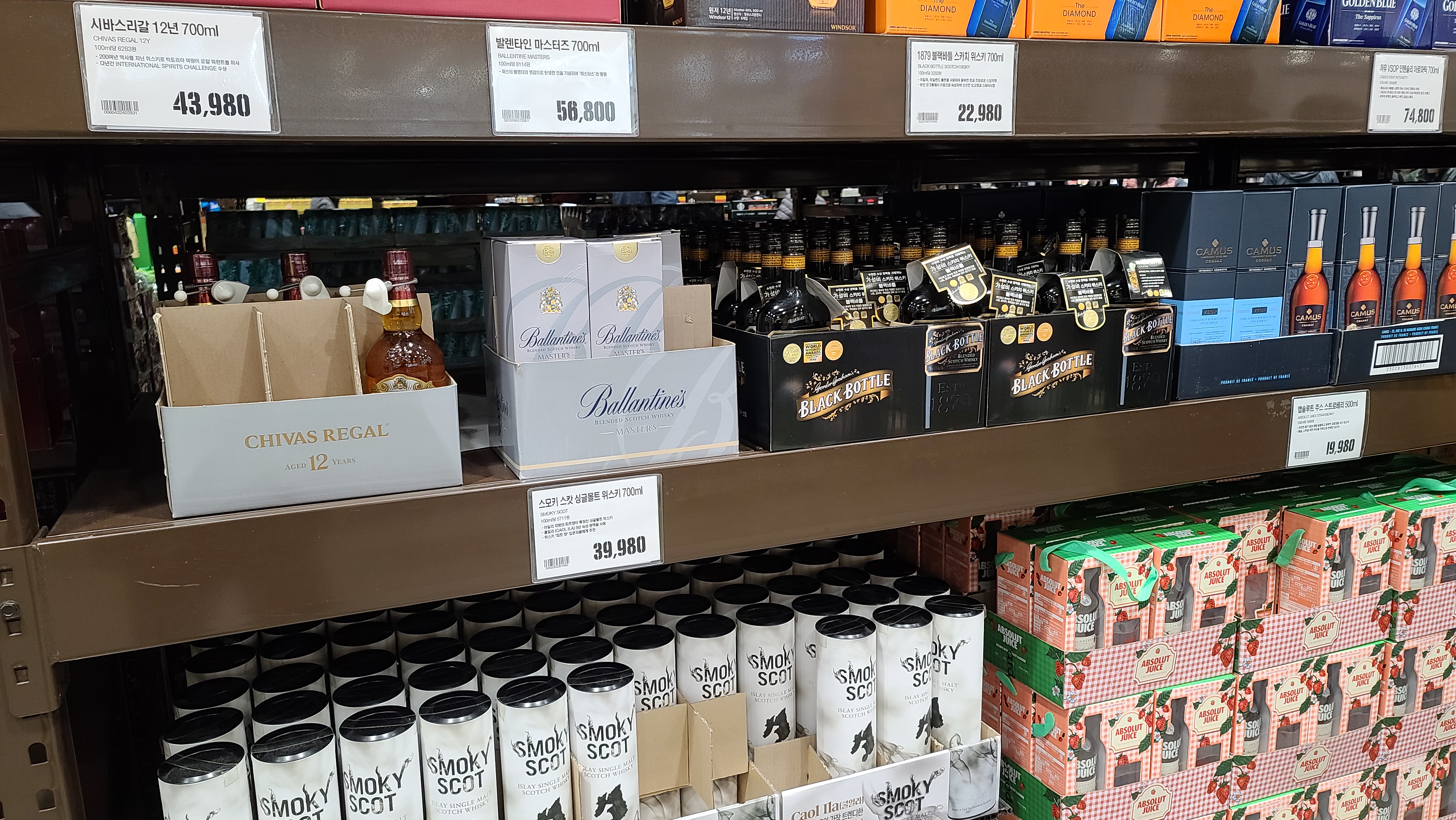 옆쪽으로 넘어가니 시바스리갈, 발렌타인 마스터즈, 1879 블랙바틀 위스키, 스모키 스캇 등 위스키와 꼬냑제품인 까뮤 VSOP와 보트가인 앱솔루트 주스 스트로베리가 진열되어 있는 것이 보입니다.