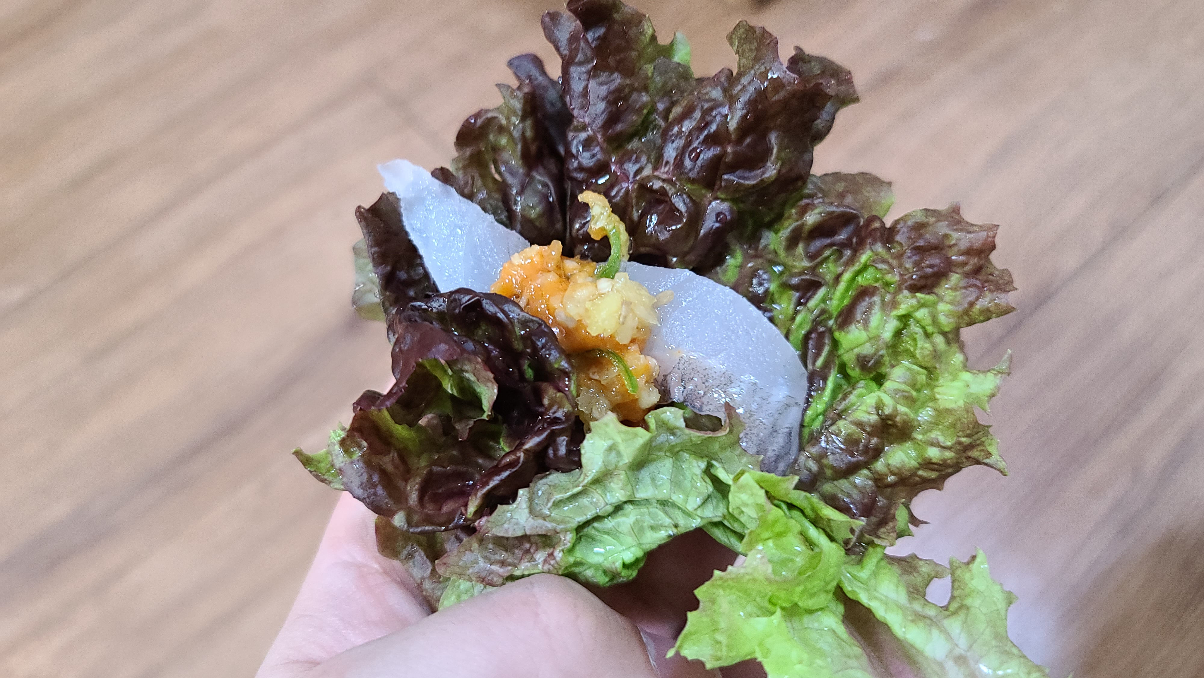 광어와 우럭을 간장에만 찍어서 그리고 쌈으로 싸서도 맛을 봅니다. 바닷가라 그런지 맛은 무척 좋게 느껴집니다만 모듬회의 충격은 아직 가시질 않습니다.